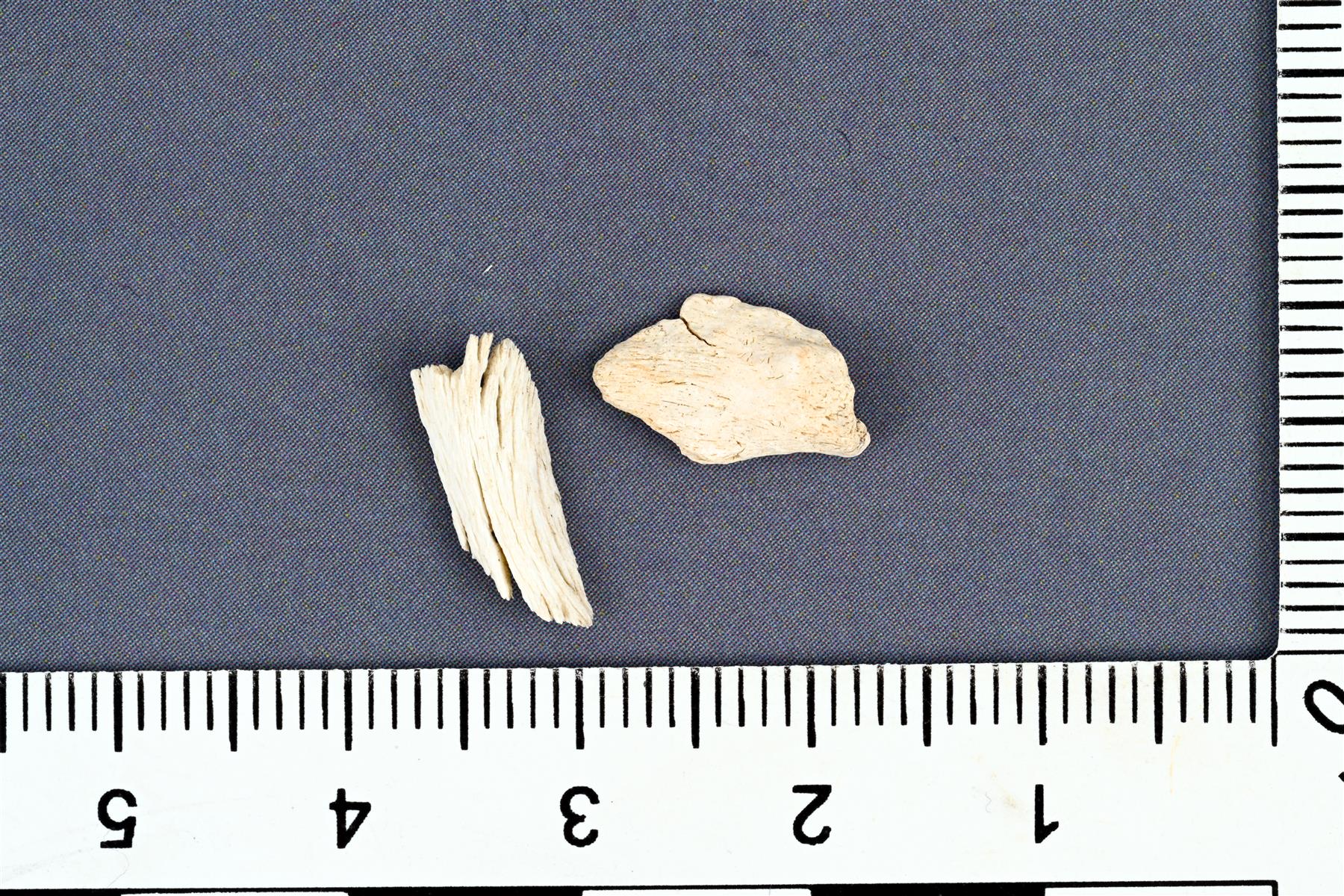 | Kaksi palaneen luun palaa. Todennäköisesti eläimen putkiluita. | |