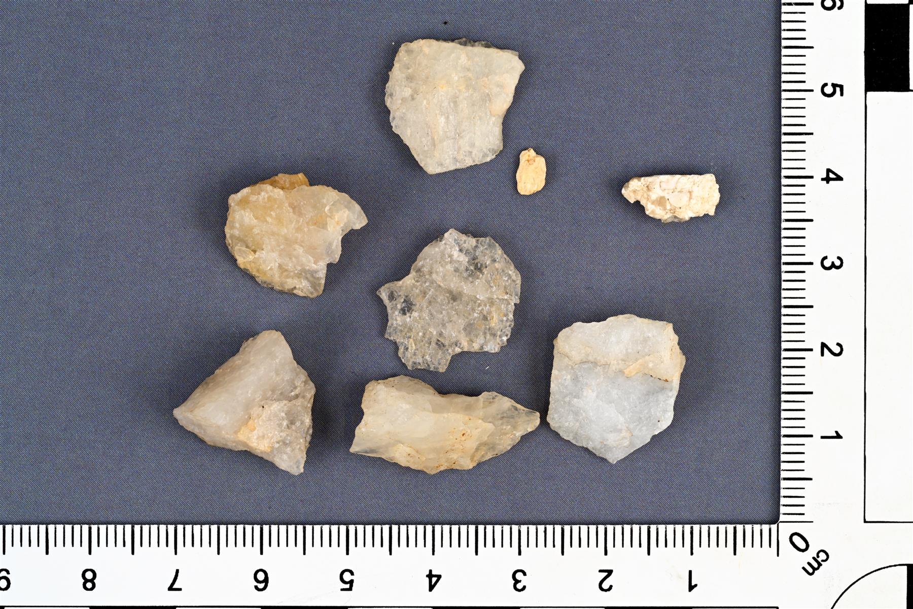 | Kuusi kvartsi-iskosta ja kaksi maasälvan palaa. | |