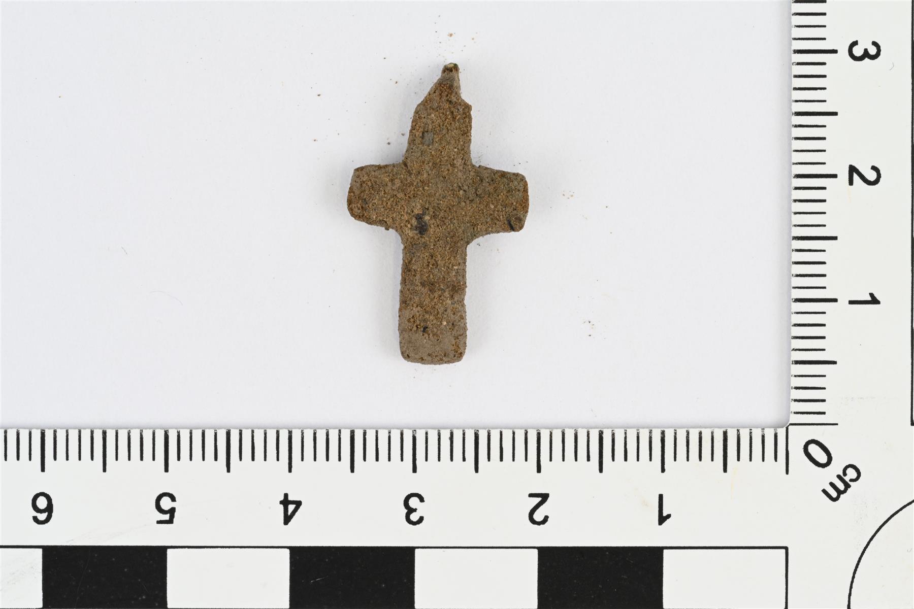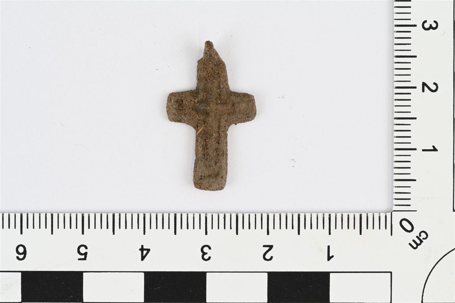 | Ristiriipus, ortodoksinen kasteristi. Yläpäästä katkennut ripustuslenkki. Etupuolella reliefinä ortodoksinen risti. Paksuus mitattu katkenneen ripustuslenkin kohdalta, riipusosan paksuus 2 mm. | |