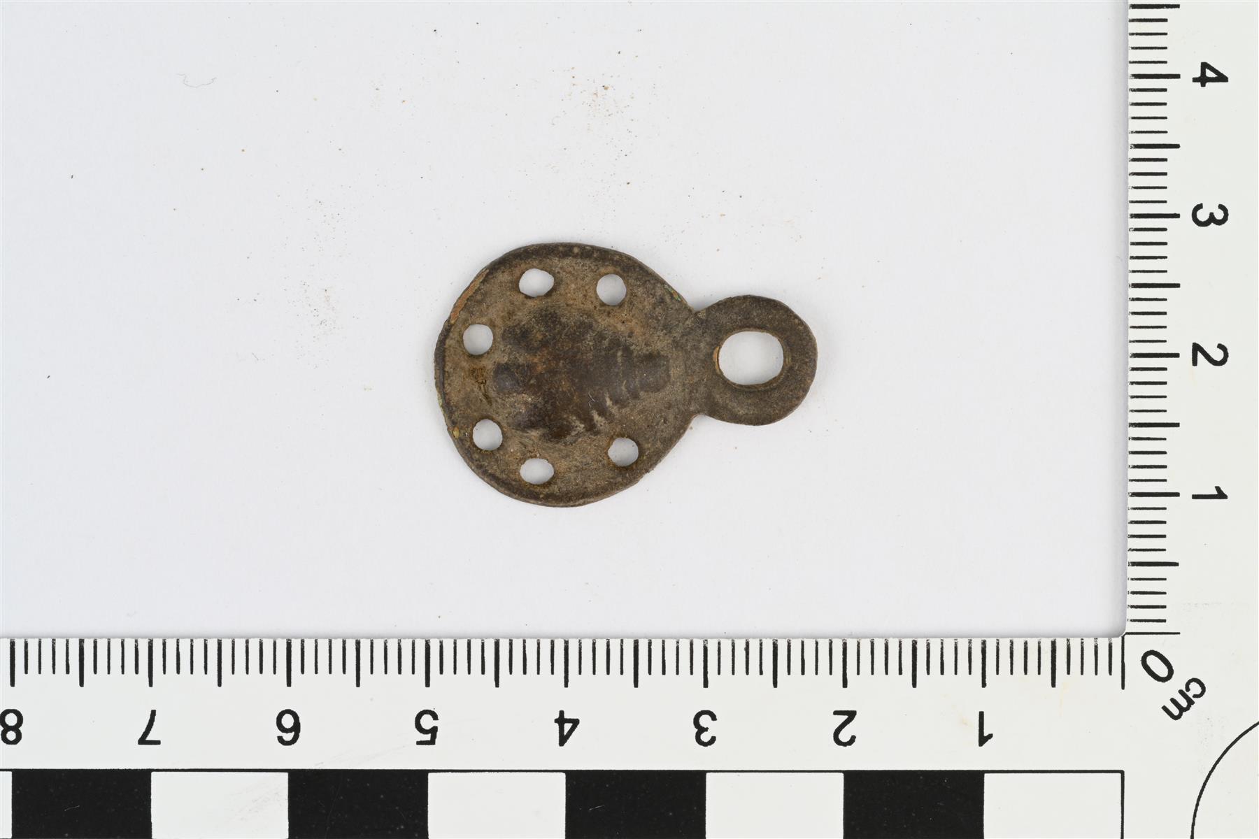 | Vaatteen hakasen vastakappale. Lähes pyöreä, hieman pisaranmuotoiseksi venyvä esine, jonka reunassa pisaran terävässä päässä ulkoneva pyöreä lenkki. Pyöreä osa reunasta levymäinen ja keskeltä kupera. Levymäisessä reunassa kuusi pyöreää reikää. Kupera osa on hieman pisaran muotoinen, ja siinä on koristelua: terävässä päässä poikittaisia kaarevia uurteita ja pyöreässä päässä pitkittäisiä uurteita, joiden väliin jää kuperat kohoumat. Valmistettu luultavasti valamalla. | |