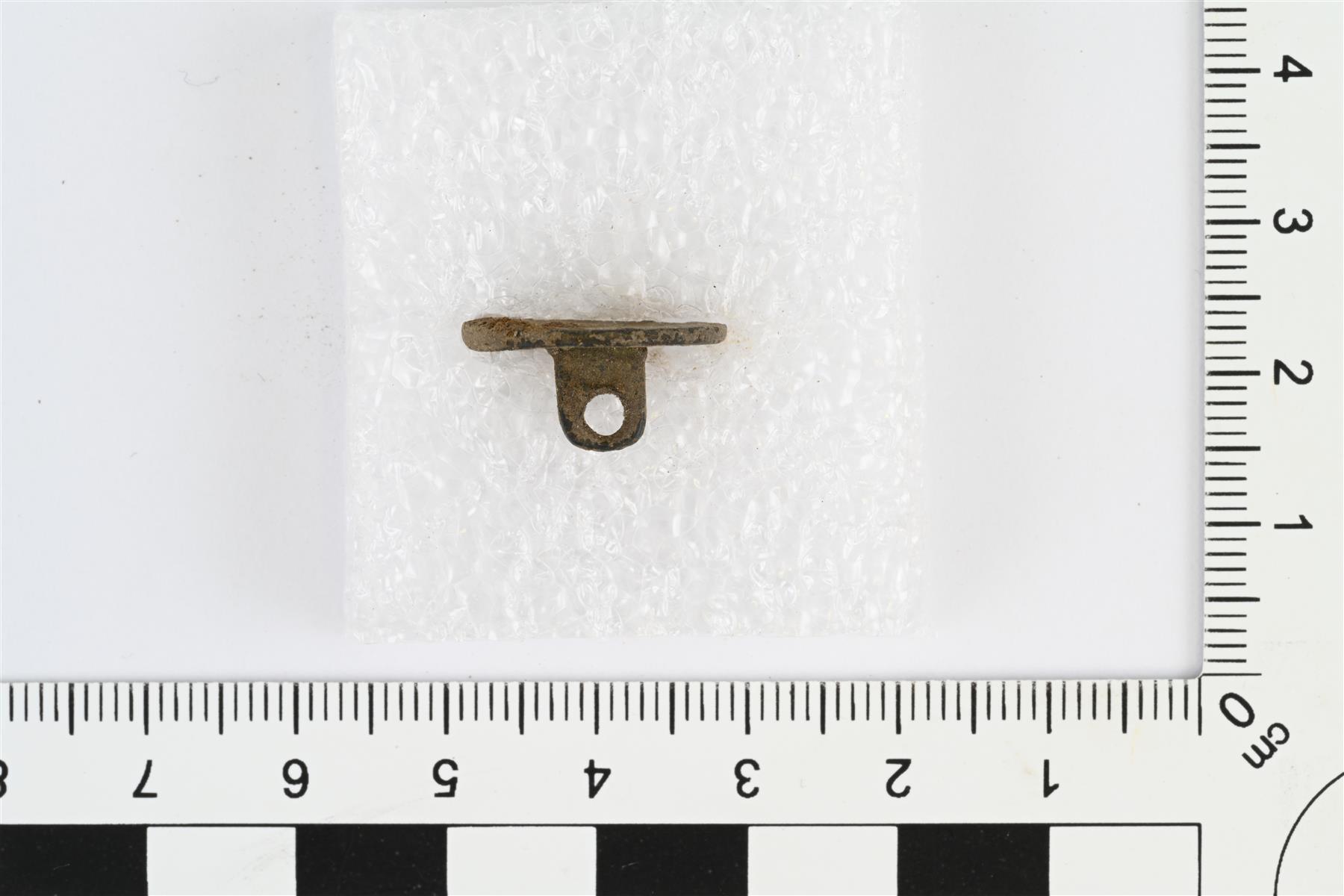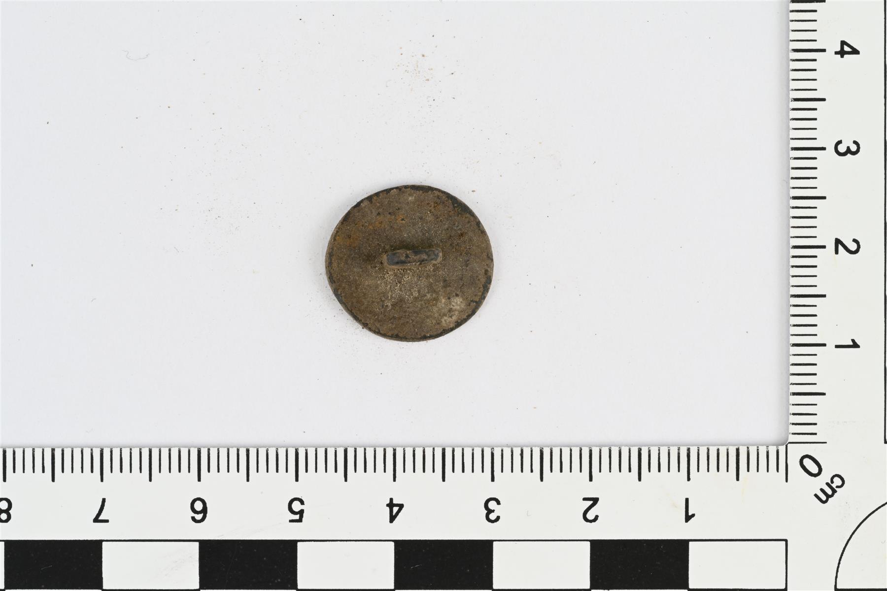 | Pyöreä litteä nappi, etupuoli hieman kovera. Taustapuolella kulmikas kanta. Etupuolella reunaa kiertävä pisteviiva ja keskellä pieni kukkakuvio. Paksuus mitattu kannan kohdalta, litteän osan paksuus 2 mm. | |