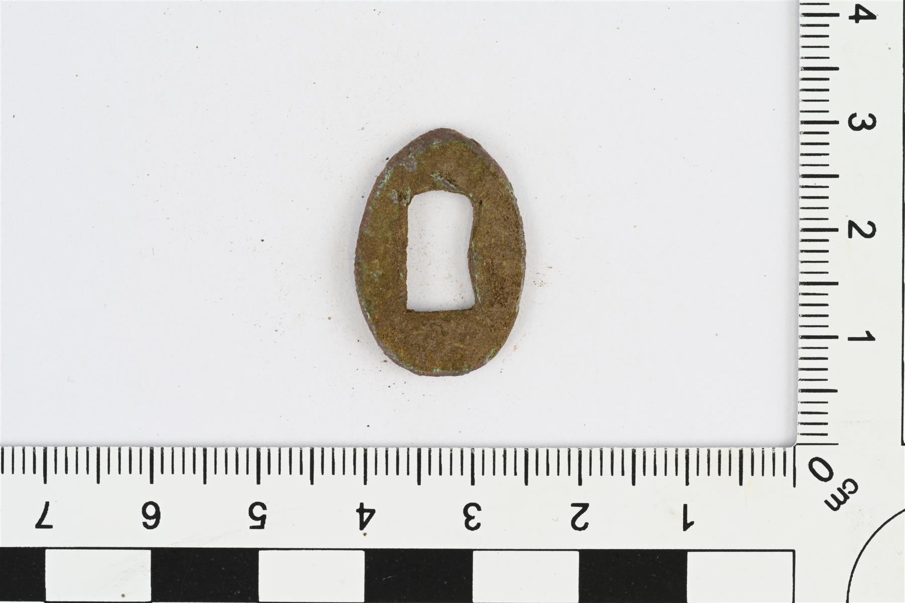 | Soikea kupariseoslevy, jonka keskellä pyöristetyn suorakulmion muotoinen reikä. | |