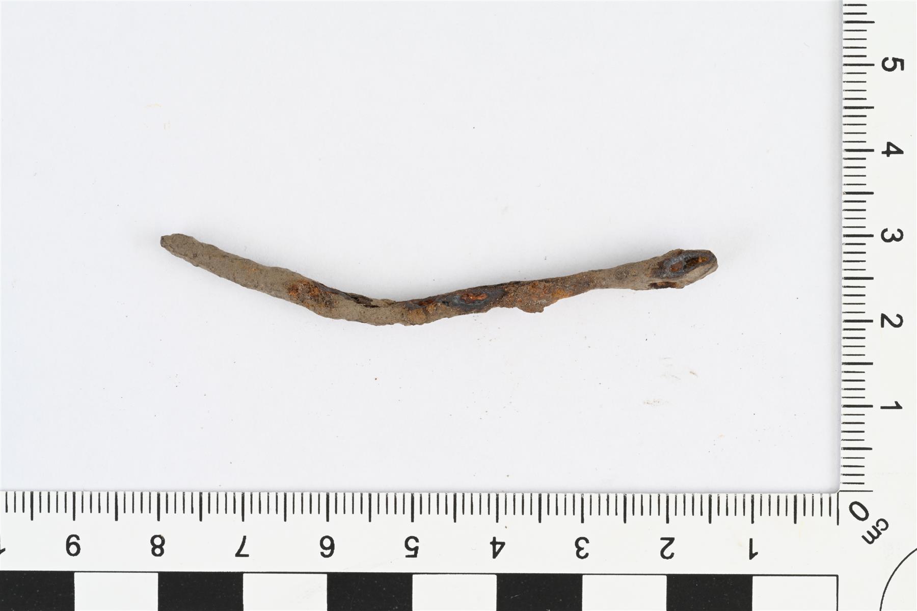 | Rautainen silmäneula. Muodoltaan litteä. Pää kulmikas ja siinä pieni pyöreä reikä. Kärki katkennut. Vääntynyt, alkuperäinen pituus noin 68 mm. | |