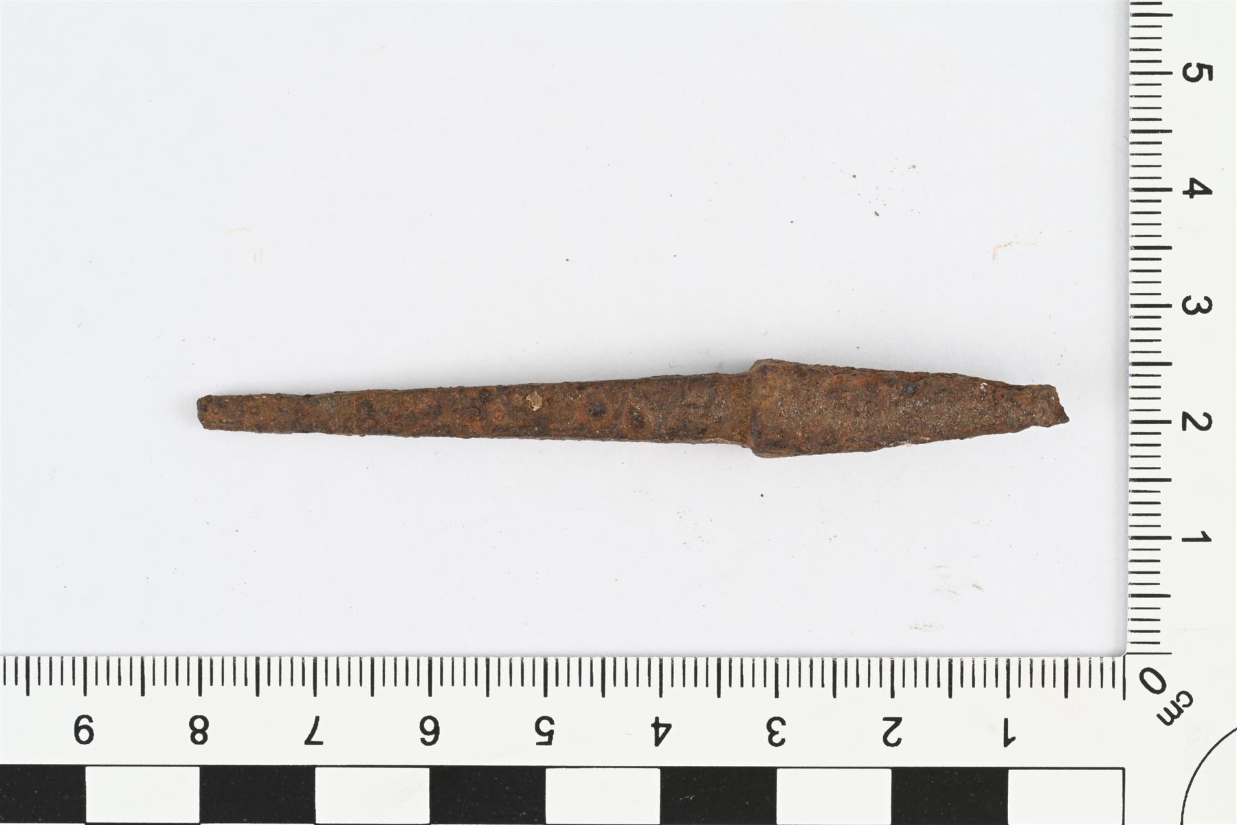 | Ruodollinen rautaesine, mahdollisesti jokin terä. Pitkänomainen, poikkileikkaukseltaan nelikulmainen. "Terää" kohti paksuneva ruoto, jonka paksummassa päässä sivusta katsoen kolmiomainen paksunnos. | |