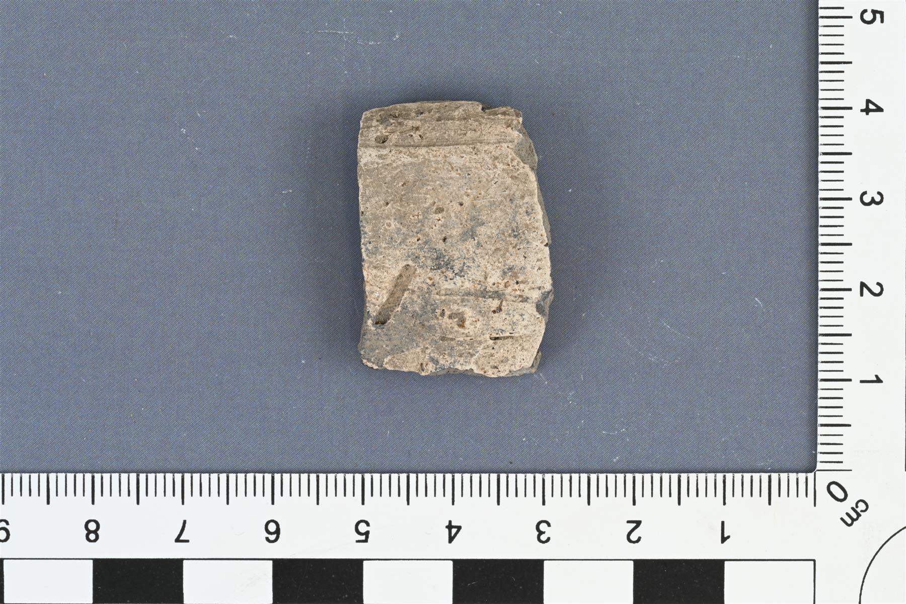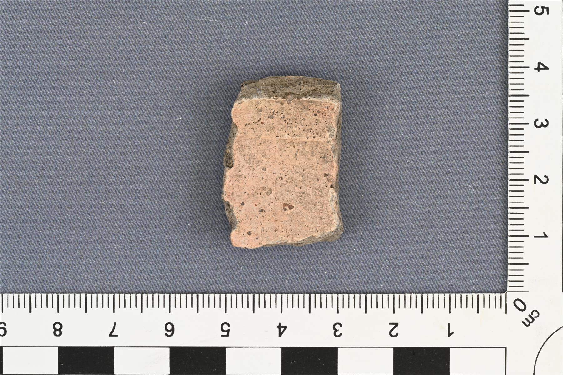 | Kylkipala. Slaavilaista keramiikkaa. Palassa loiva taite, jonka kohdalla ulkopinnalla kapeita uria. Myös palan toisessa päässä kaksi vaakasuoraa uraa ja niiden päällä lyhyt vinoviivan muotoinen ura. Hiekka- tai kivimurskasekoite. Savimassa palan sisältä harmaa, ulkopinta valkoinen ja sisäpinta vaaleanpunertava. Pinnoilla mahdollisesti savilietesilaus. Seinämän paksuus 5-8 mm. | |