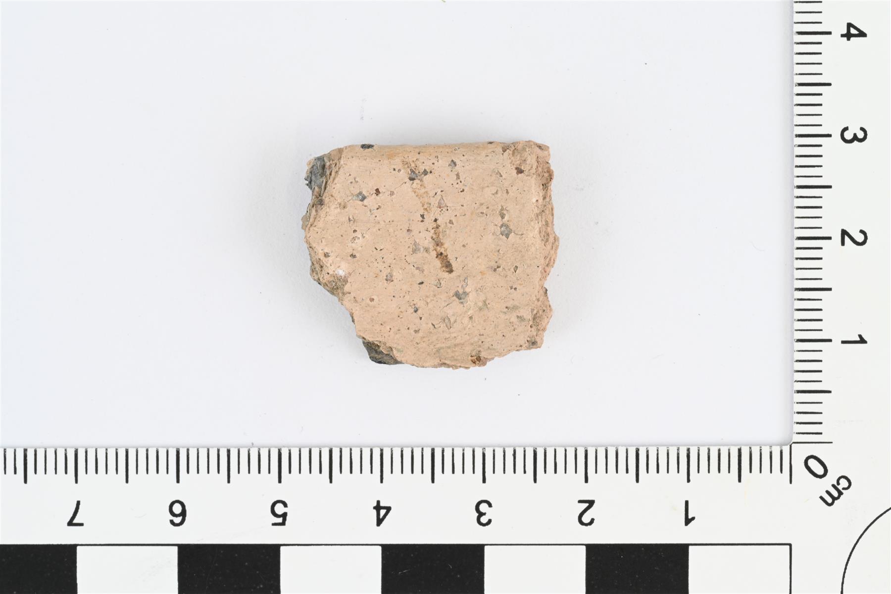 | Suureunapala. Slaavilaistyyppistä keramiikkaa, slaavilaista tai karjalaista. Reuna profiloitu, reunan ulkopinnalla kevyt paksunnos ja reunan päällä ura. Hiekka- tai kivimurskasekoite. Savimassa vaalean punertavan ruskea, palan sisältä osittain harmaa. Reunan paksuus 7 mm, seinämän paksuus 5-6 mm. | |