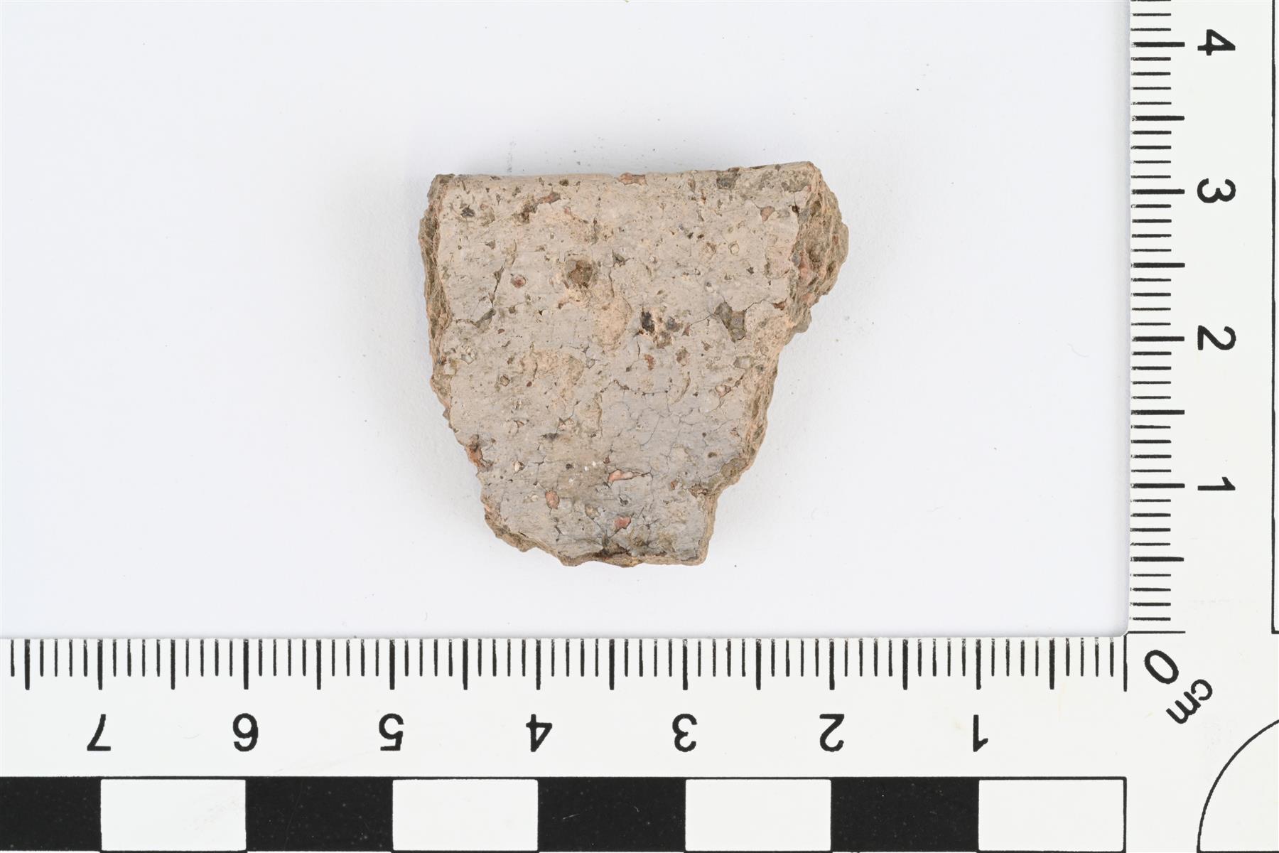 | Suureunapala. Slaavilaistyyppistä keramiikkaa, slaavilaista tai karjalaista. Reuna profiloitu, reunan ulkopinnalla kevyt paksunnos ja reunan päällä ura. Hiekka- tai kivimurskasekoite, sekoitetta runsaasti. Savimassa harmaa, paikoin vaaleanpunertava. Reunan paksuus 7 mm, seinämän paksuus 5-6 mm. | |
