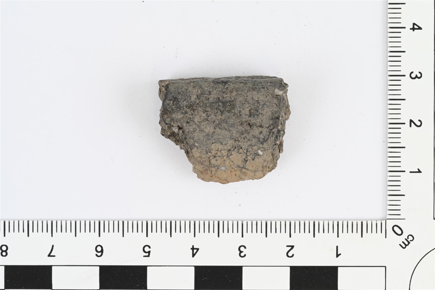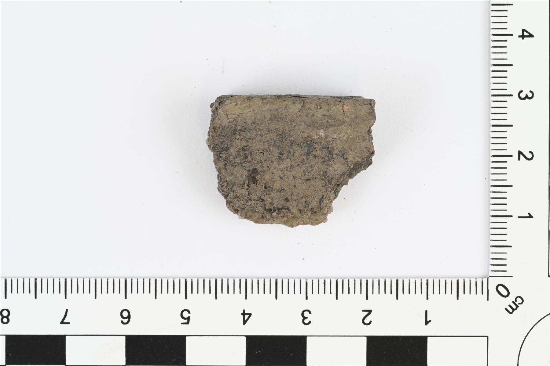 | Suureunapala. Karjalaista keramiikkaa. Reuna profiloitu, reuna hieman ulospäin taipuva, ulkopinnalla paksunnos, reunan päällinen tasainen. Hiekka- tai kivimurskasekoite. Savimassan väri vaihtelee harmaanruskeasta tummanharmaaseen. Reunan paksuus 10 mm, seinämän paksuus 7 mm. | |