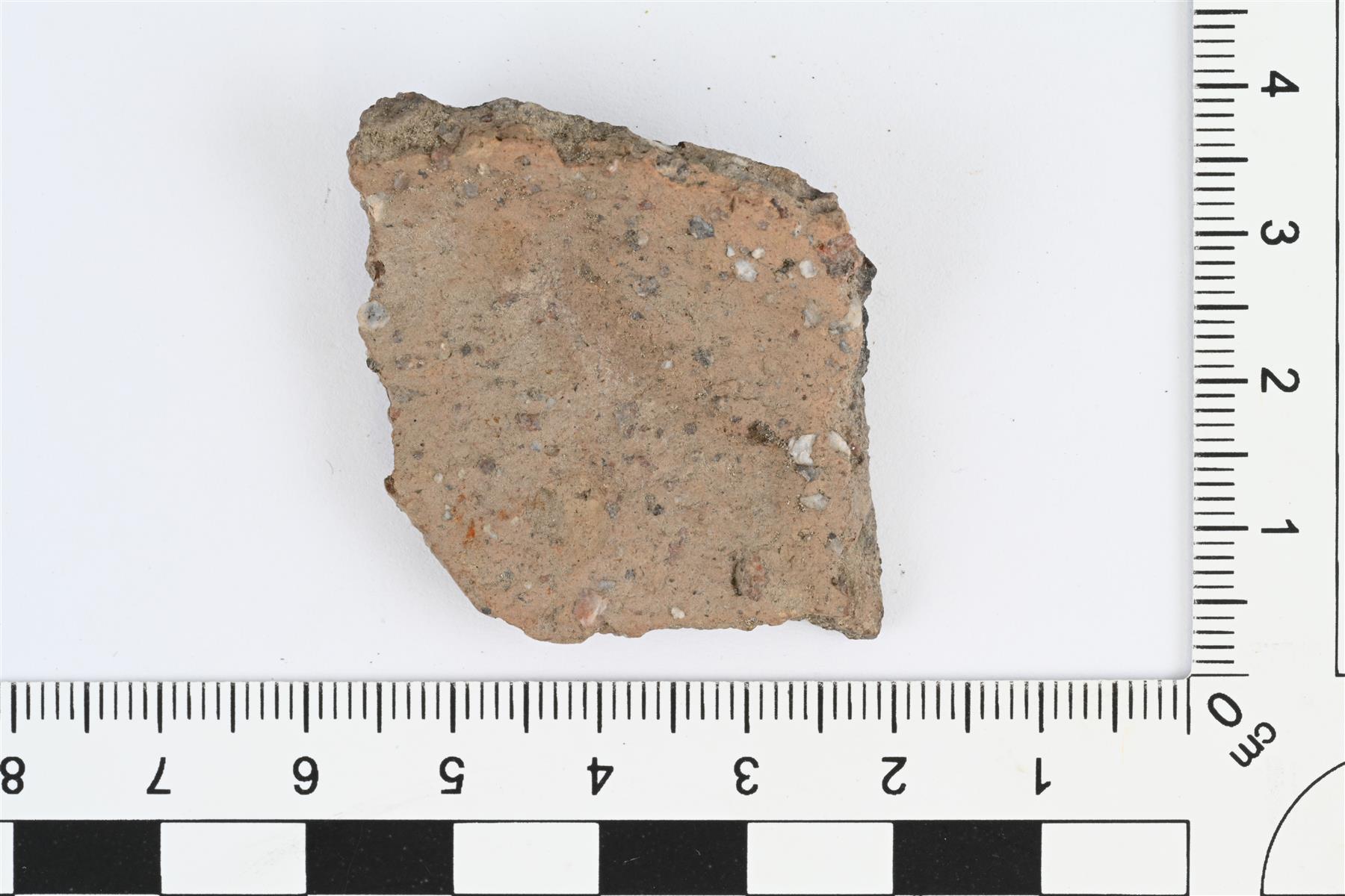 | Kylkipala. Karjalaista keramiikkaa. Palassa taite. Melko karkea hiekka- tai kivimurskasekoite, sekoitetta runsaasti. Savimassan väri sisäpinnan puolella vaalean punertavanruskea ja ulkopinnan puolella tummanharmaa tai lähes musta. Seinämän paksuus 5-7 mm. | |