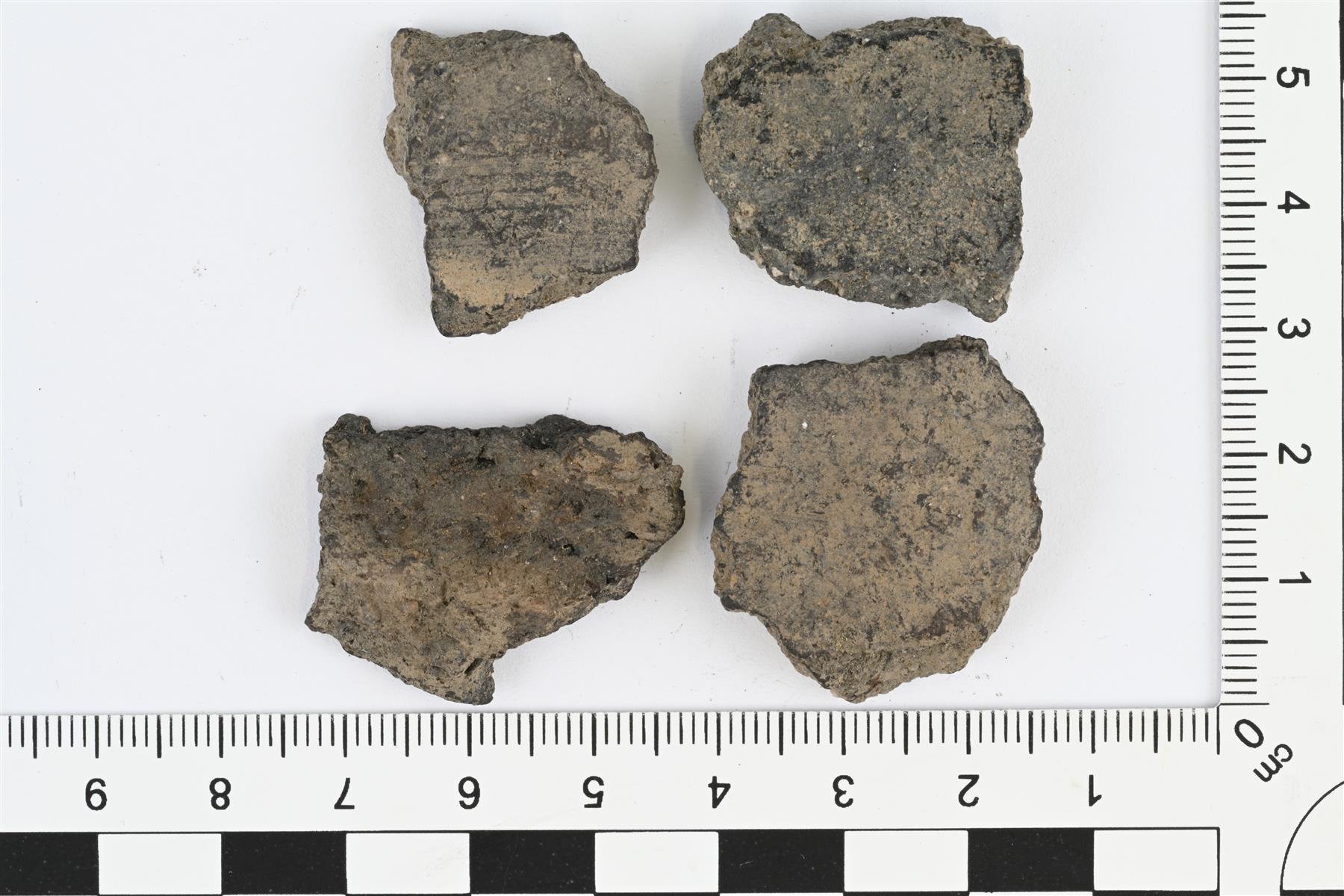 | Kylkipaloja, luultavasti eri astioista. Karjalaista keramiikkaa. Melko karkea hiekka- tai kivimurskasekoite, sekoitetta runsaasti. Savimassa tummanharmaa tai lähes musta. Palojen koot 28 x 26 x 7 mm, 27 x 24 x 8 mm, 25 x 21 x 6 mm, 29 x 24 x 5 mm. Yhden palan ulkopinta lohjennut pois. Seinämän paksuus 6-8 mm. | |