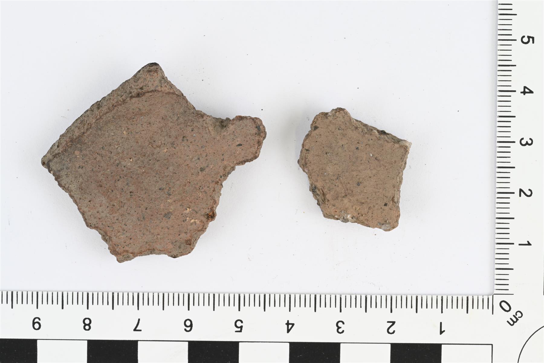 | Kylkipaloja, mahdollisesti eri astioista. Karjalaista keramiikkaa. Hiekka- tai kivimurskasekoite. Savimassa hieman punertavan ruskea, ulkopinta musta. Palojen koot 38 x 44 x 6 mm ja 21 x 21 x 5 mm. Seinämän paksuus 5-6 mm. | |