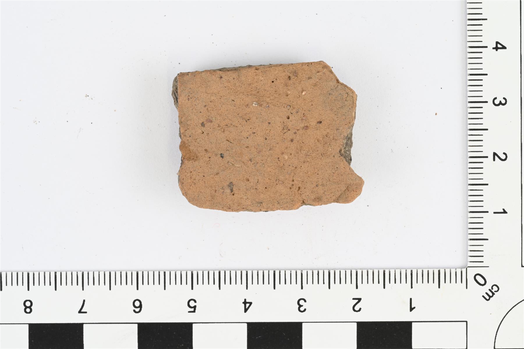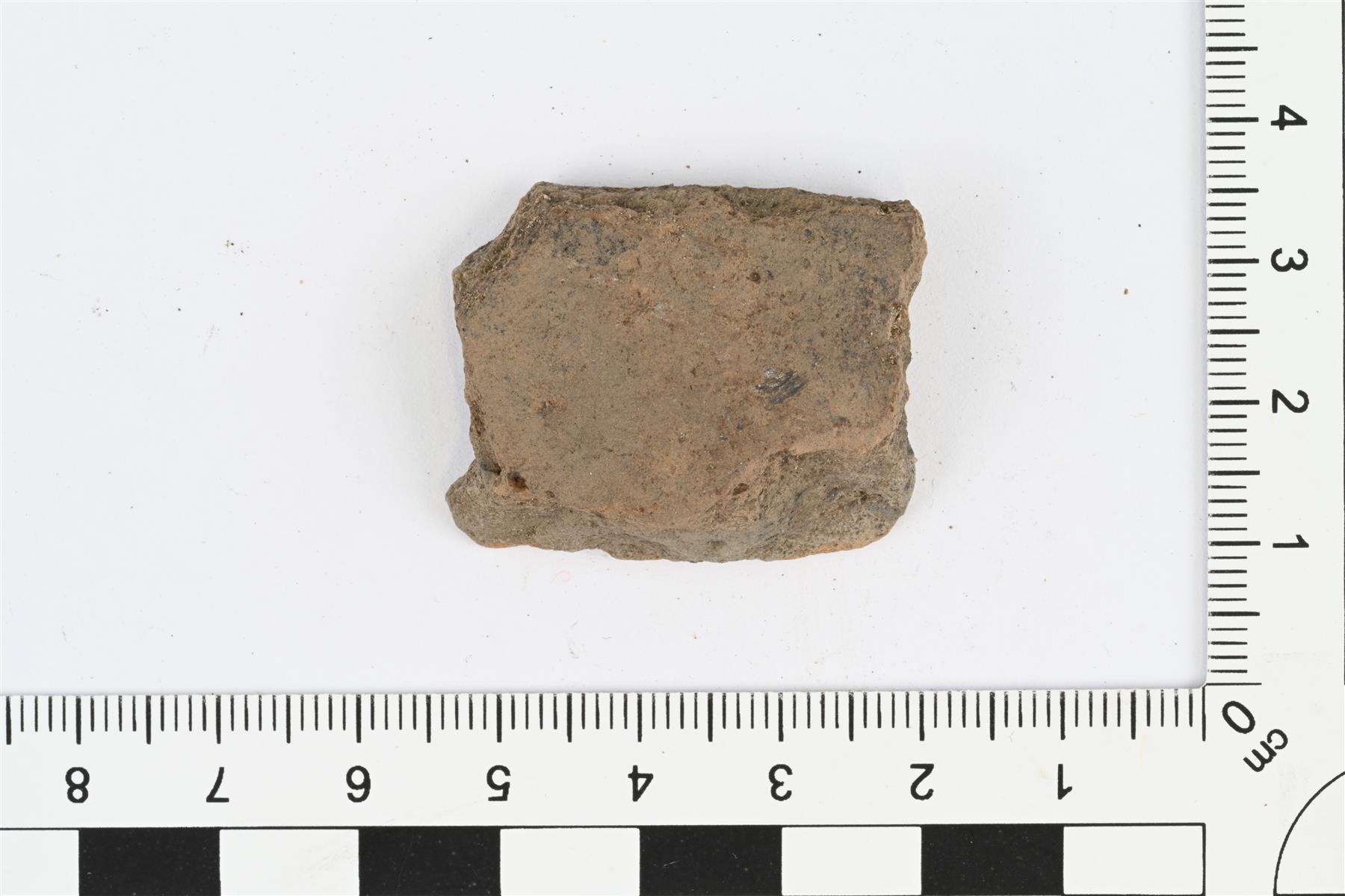| Kylkipala. Karjalaista keramiikkaa. Hiekka- tai kivimurskasekoite. Savimassa ulkopinnalta harmaanruskea, sisäpinnalta punaruskea ja palan sisältä harmaa. Seinämän paksuus 6-9 mm. | |