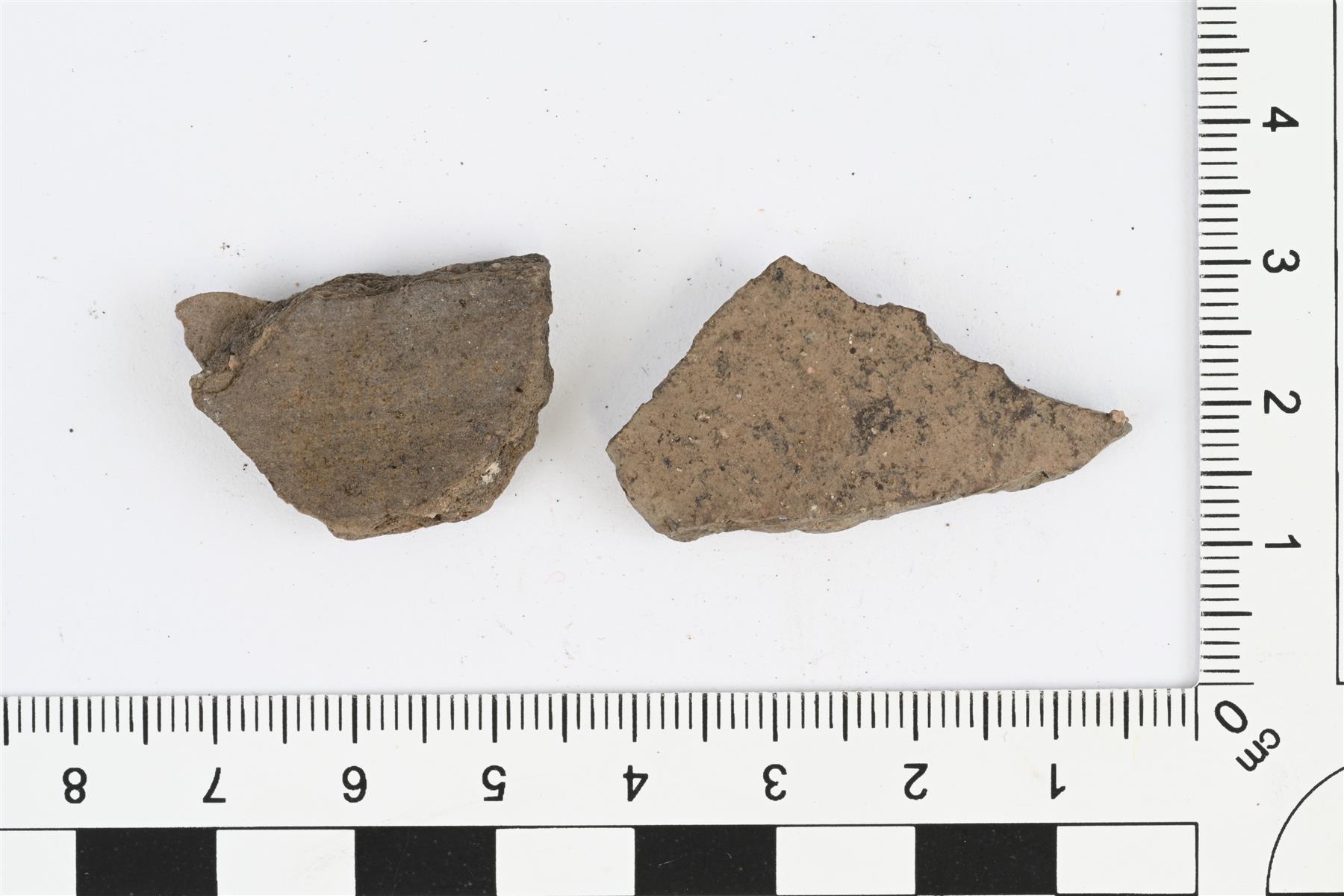 | Kylkipaloja, luultavasti eri astioista. Karjalaista keramiikkaa. Hiekka- tai kivimurskasekoite. Savimassa harmaanruskea, ulkopinta musta. Palojen koot 34 x 25 x 6 mm ja 26 x 18 x 6 mm. Seinämän paksuus 5-6 mm. | |