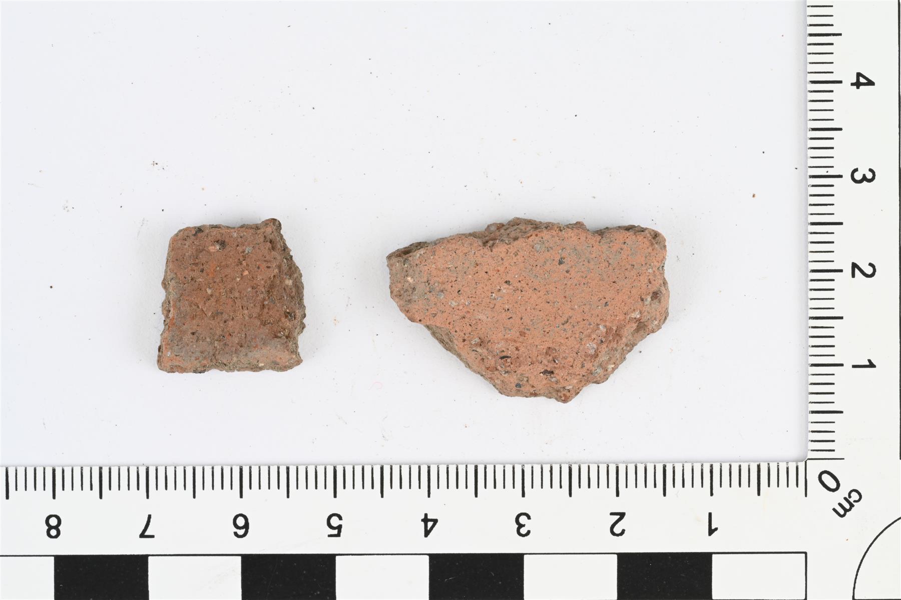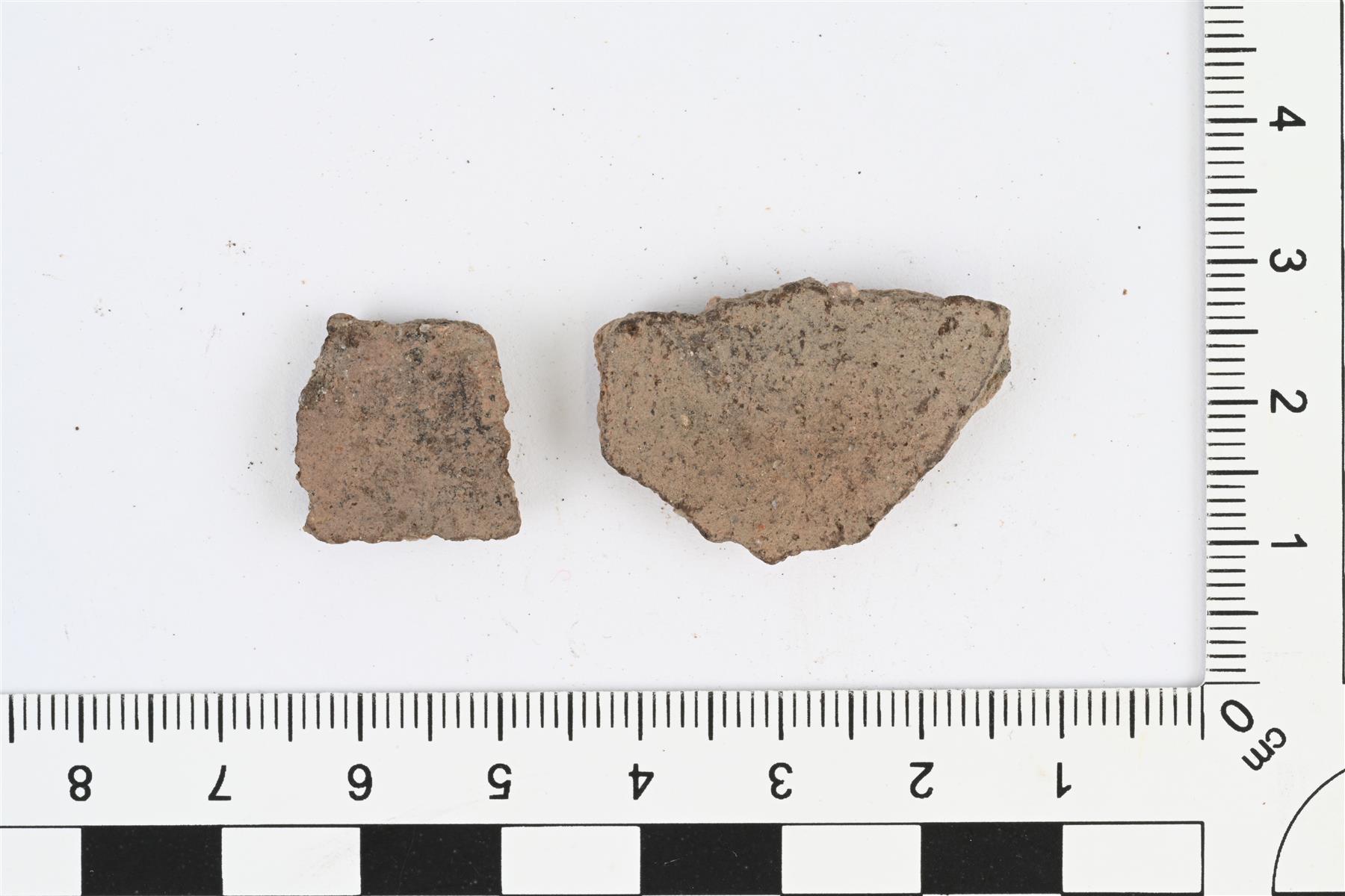 | Kylkipaloja, luultavasti eri astioista. Karjalaista keramiikkaa. Hiekka- tai kivimurskasekoite. Savimassa punaruskea, ulkopinta tummanharmaa. Palojen koot 30 x 20 x 6 mm ja 16 x 16 x 4 mm. Toisen palan sisäpinta lohjennut pois. Palassa, jossa molemmat pinnat, seinämän paksuus 5-6 mm. | |