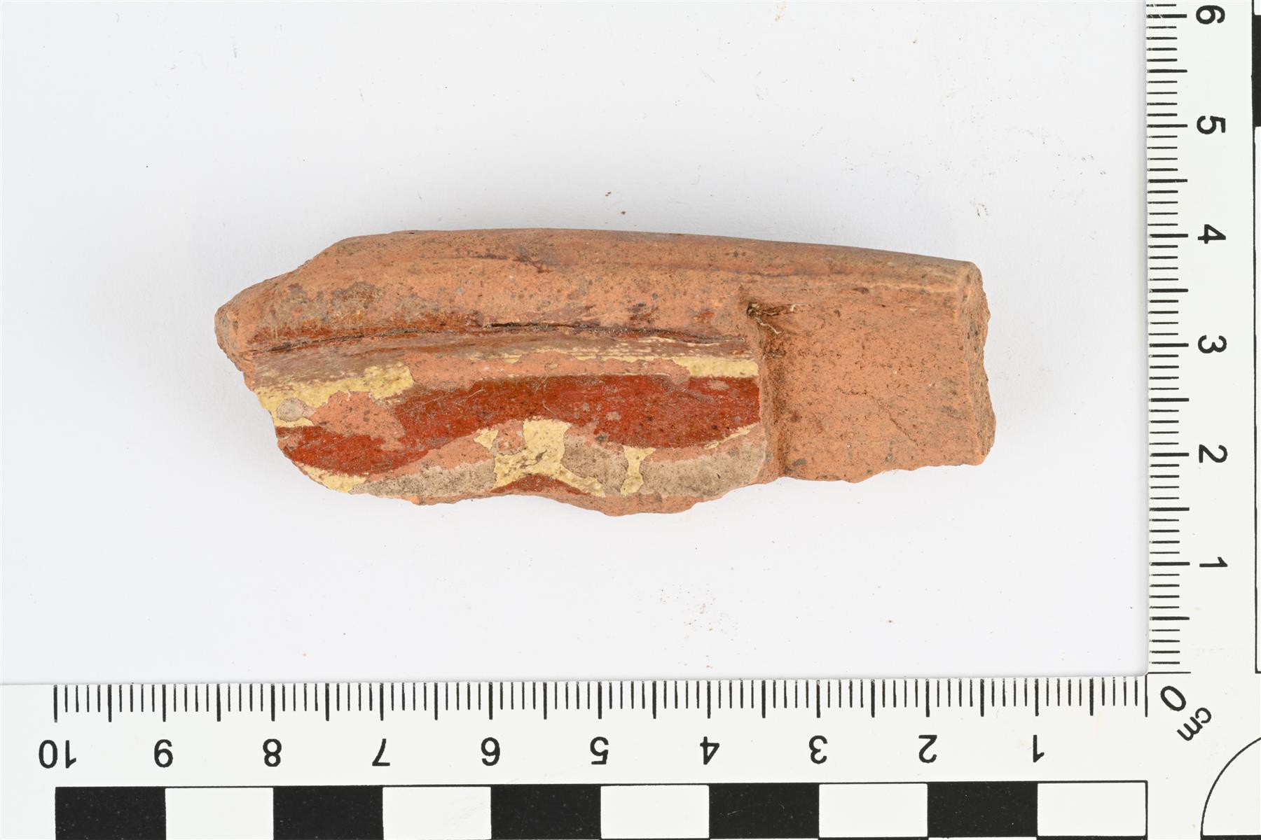 | Boluskoristeisen vadin reunapala. Reunan ulkopinnalla paksunnos. Sisäpinnalla valkosaviraita ja -aaltoviiva sekä väritön lyijylasite. Pinnat osittain lohjenneet pois. | |