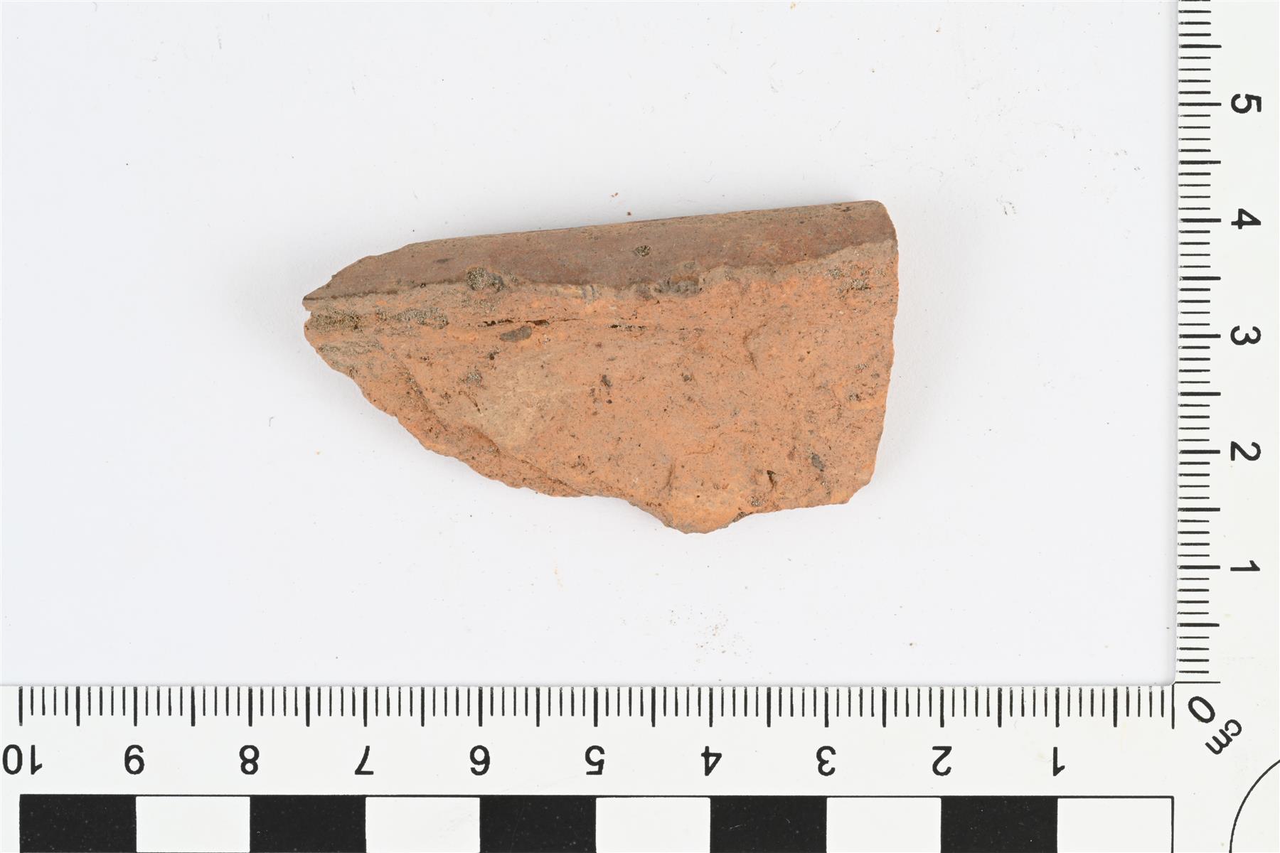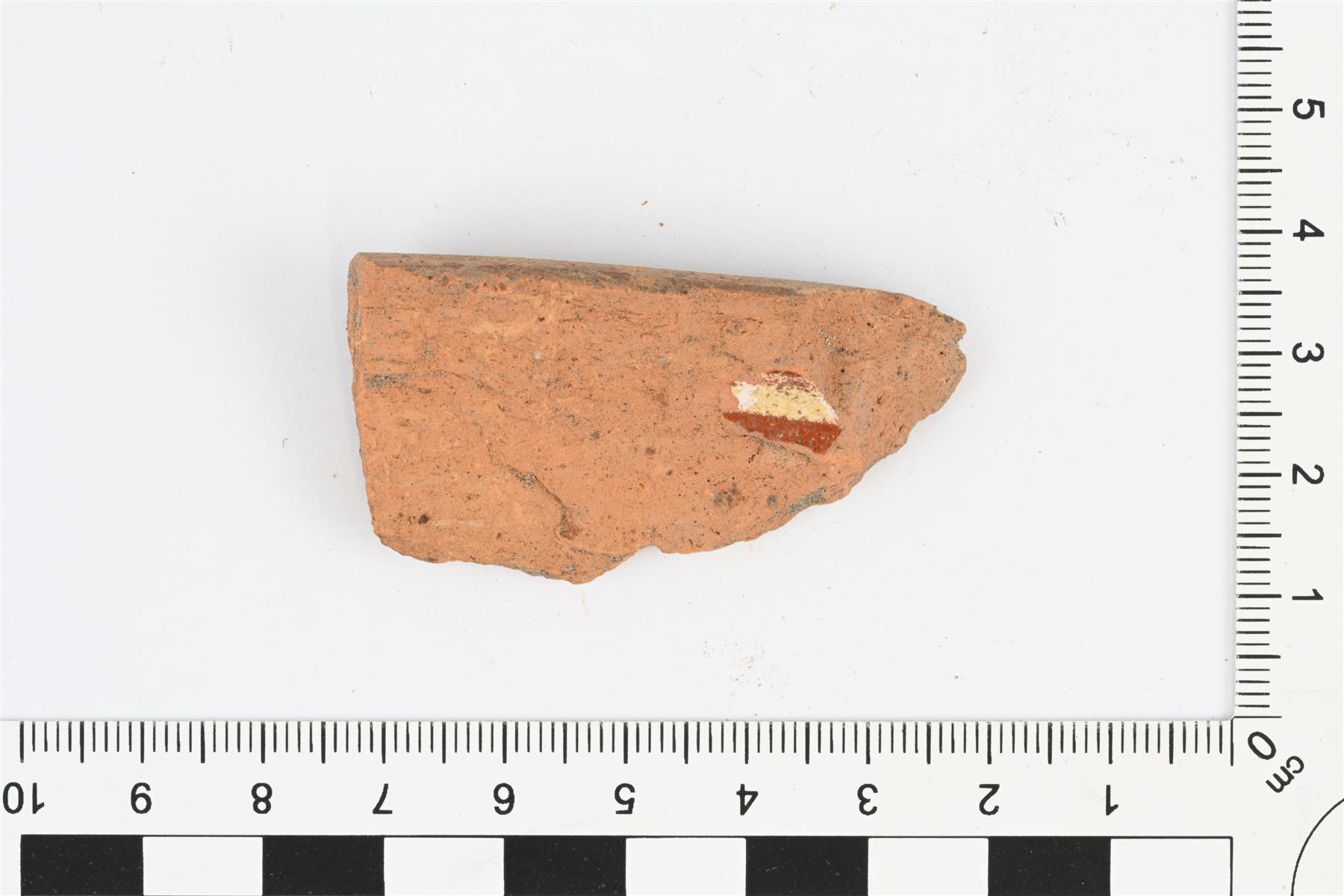 | Boluskoristeisen vadin reunapala. Sisäpinnalla jäljellä hieman valkosaviraitaa ja väritöntä lyijylasitetta. Pinnat suurimmaksi osaksi lohjenneet pois. | |
