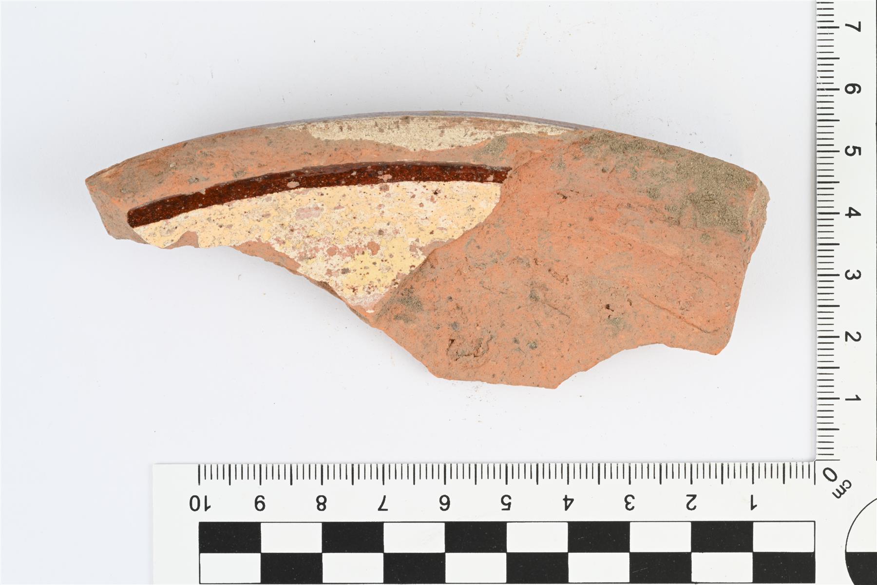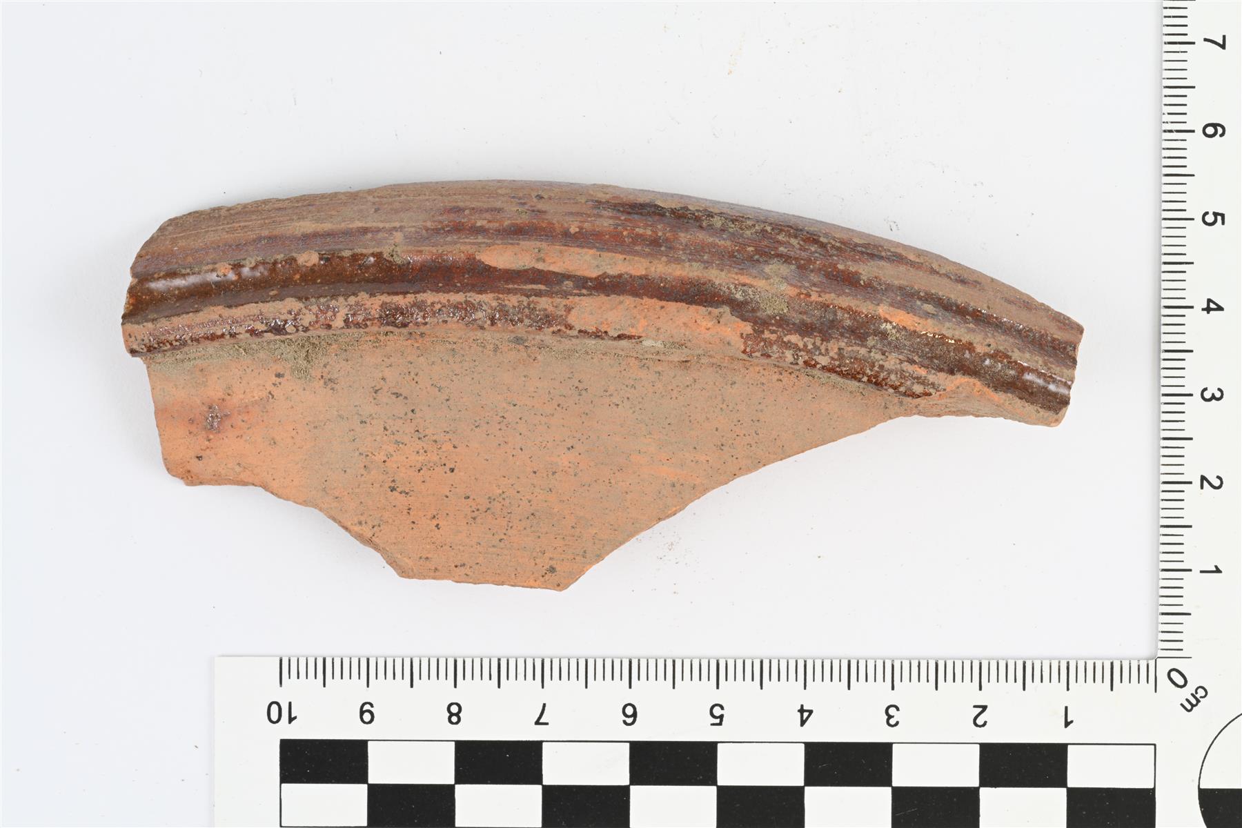 | Boluskoristeisen kulhon suureunapala. Reuna profiloitu: reunassa ulkopinnalla paksunnos, joka muodostaa harjanteen reunan ja kyljen taitteeseen, reunan ulkopinnalla myös horisontaalisia uria. Jäljellä olevassa sisäpinnassa yhtenäinen valkosaviliete, reunassa raita jossa ei savilietettä, ja reunan päällä valkosaviraita. Sisäpinnalla väritön lyijylasite, jota myös reunan ulkopinnalla. | |