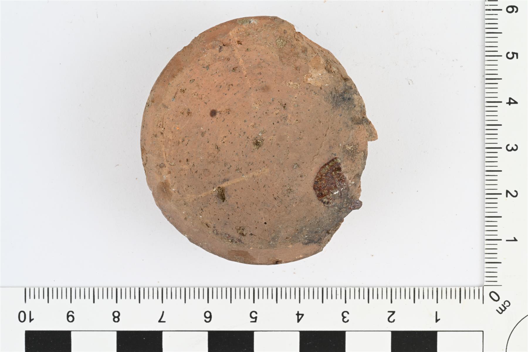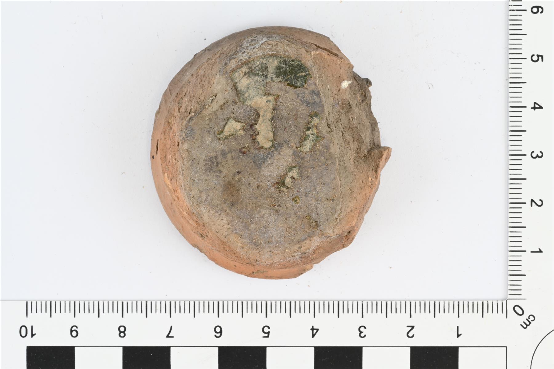 | Astian jalkalevy. Kooltaan pieni, astian kyljet ilmeisesti levenneet selvästi jalkalevyä suuremmaksi. Mukana astian sisäpintaa, jossa jäänteitä vihreästä lyijylasitteesta. Pohjan ulkopinnalla läikkä ruskeaa lyijylasitetta. | |
