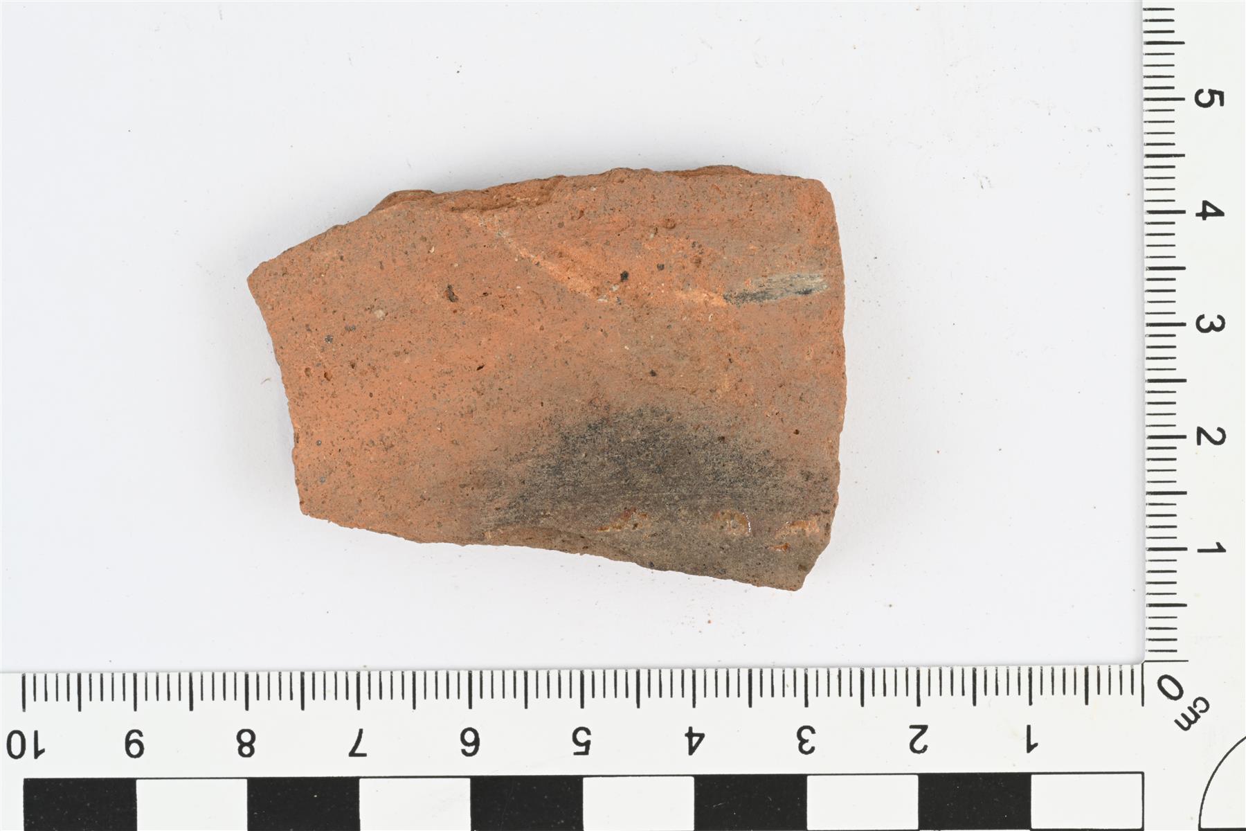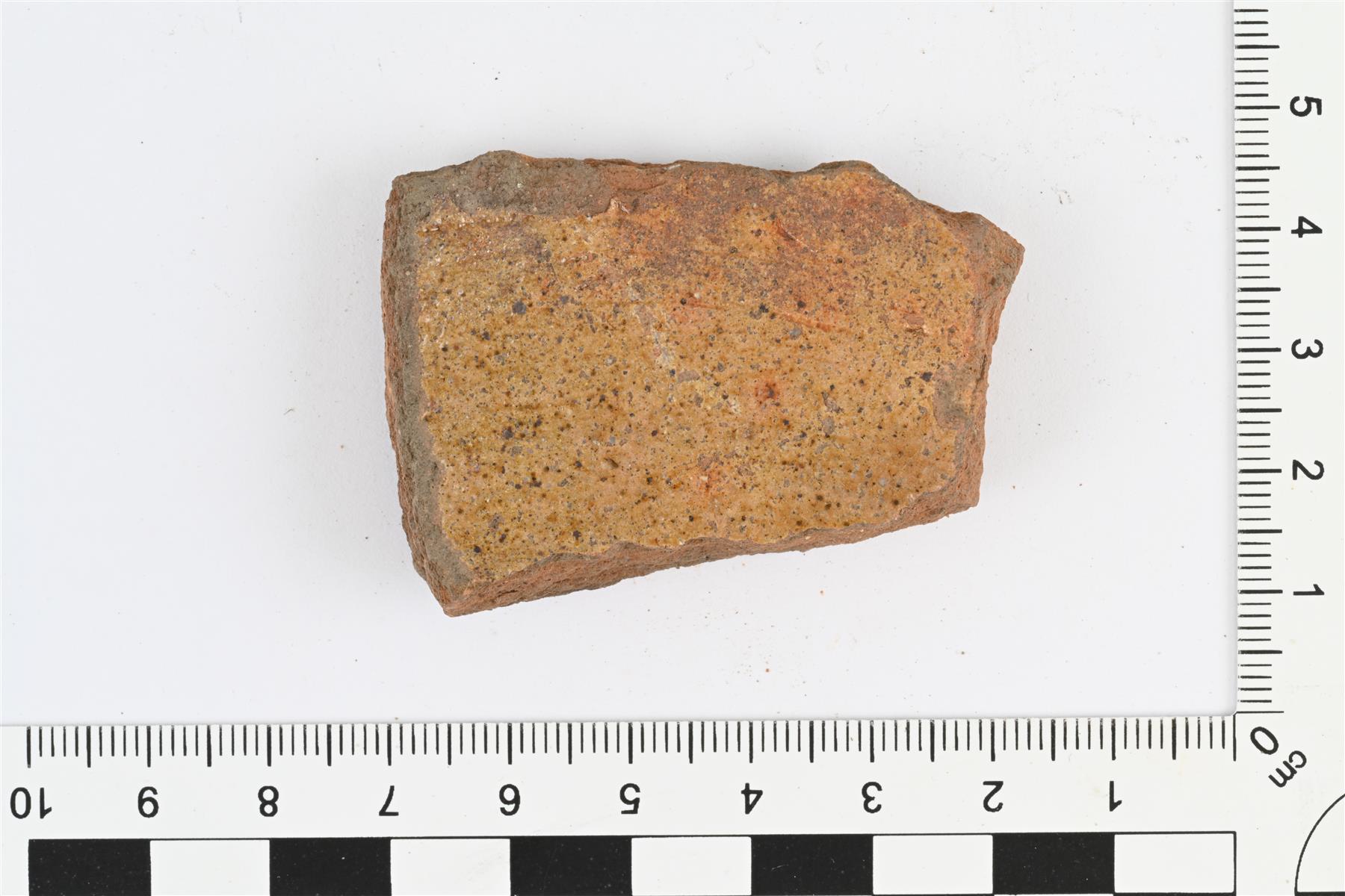 | Pohjanreunapala, luultavasti vadista tai kulhosta. Pohjanreuna profiloimaton. Sisäpinnalla keltainen ruskeatäpläinen lyijylasite. Pohja ja pohjanreuna mustuneet. | |