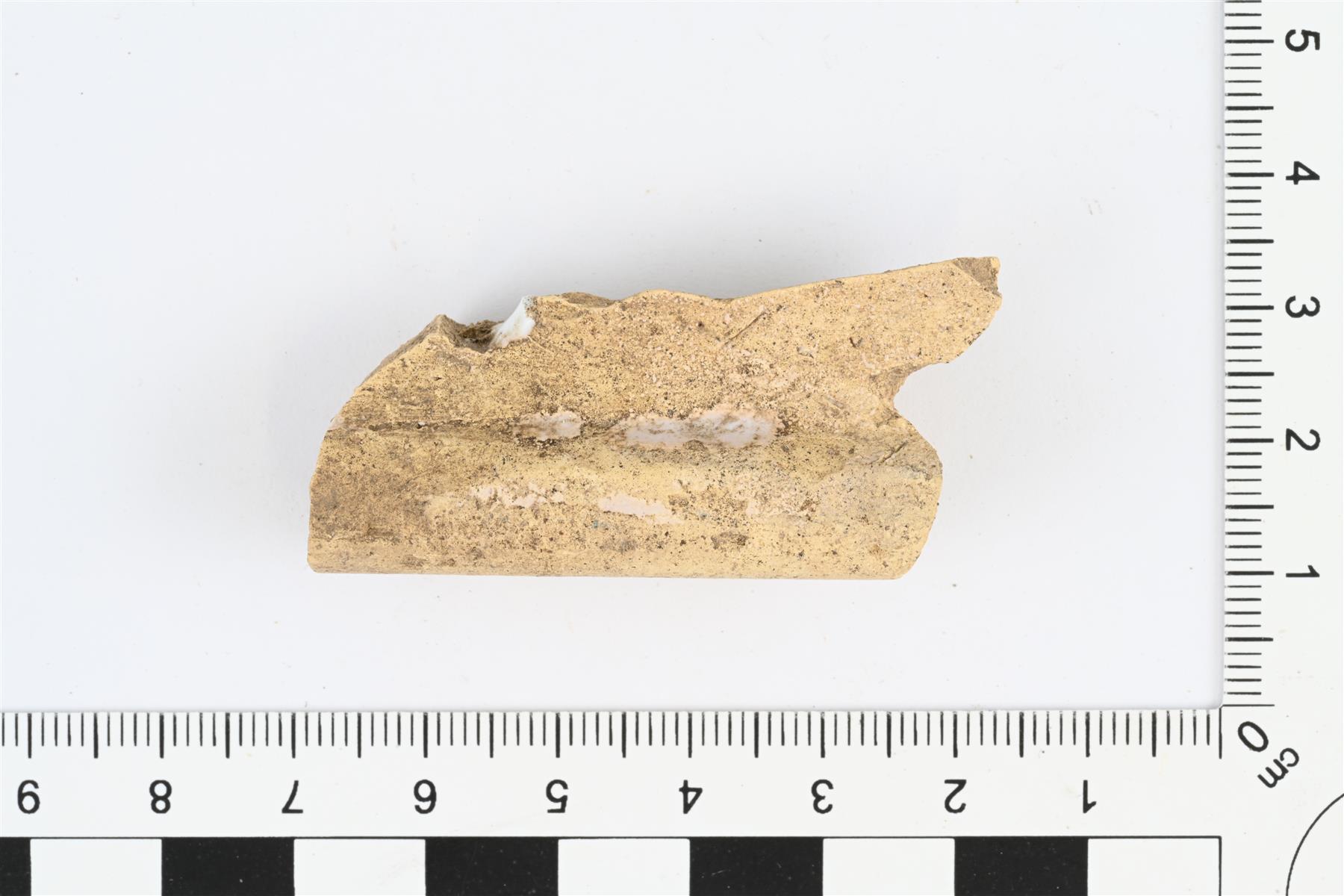 | Fajanssikaakelin kiinnityslistan katkelma. Pinnalla läikkinä valkoista tinalasitetta. | |