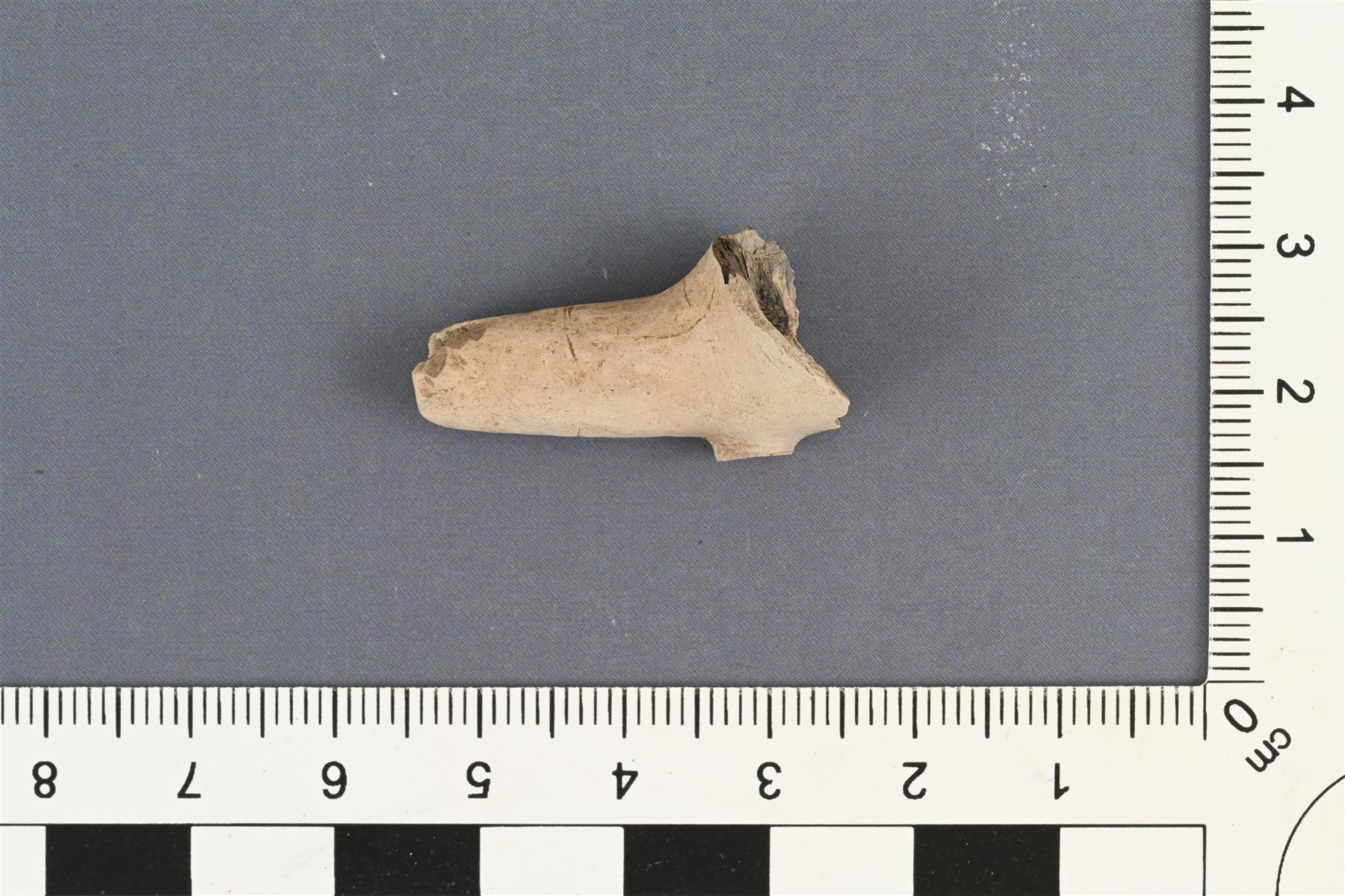 | Katkelma liitupiipun kopan ja varren liitoskohdasta. Mukana hieman kopan alareunaa, jalka ja vartta. Jalka katkennut. Varren murtunut pää pyöristynyt ja kulunut sileäksi, joten todennäköisesti piippu on ollut käytössä lyhyeksi katkenneen varren kanssa. Varren pituus noin 20 mm. | |
