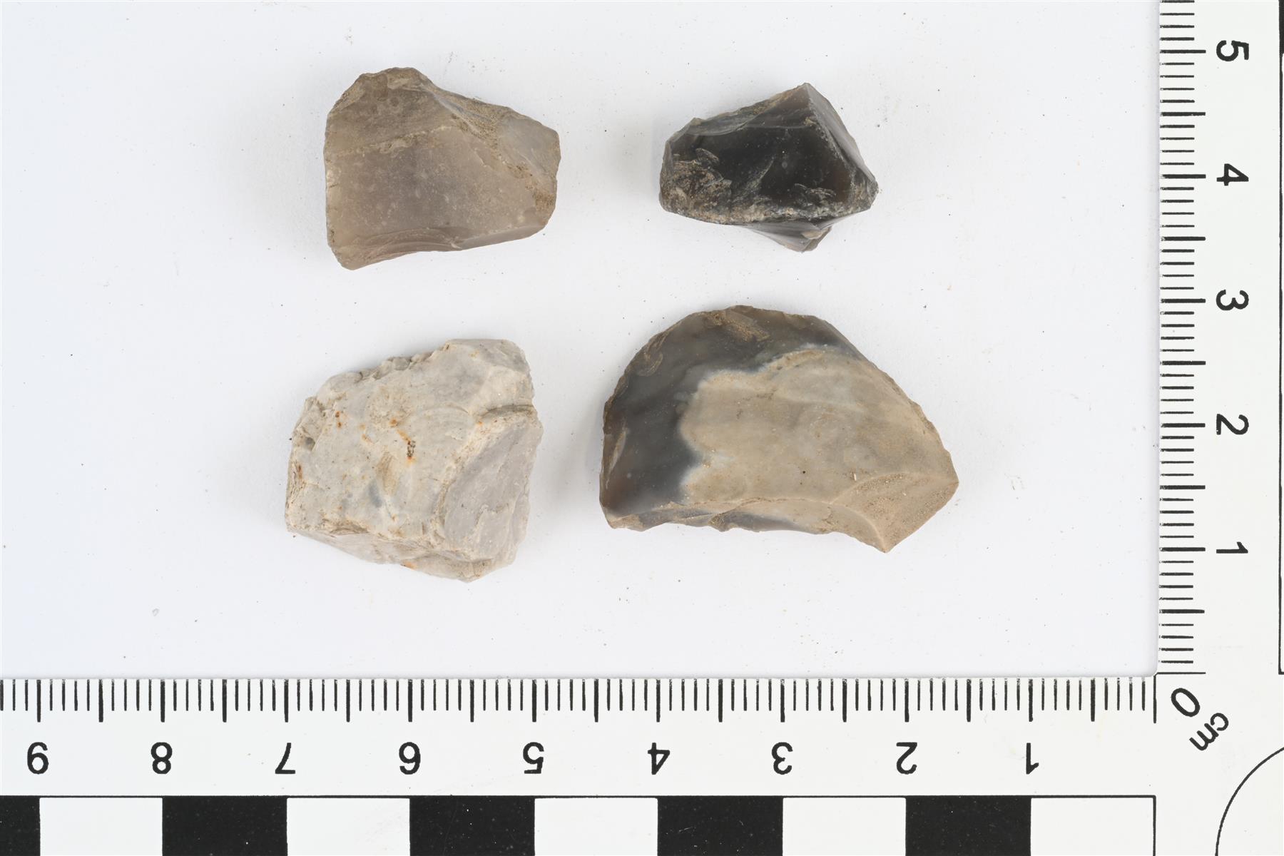 | Tuluspiin paloja. Särmikkäitä paloja, joista lyöty iskoksia. Palojen koot 29 x 18 x 9 mm, 23 x 18 x 13 mm, 19 x 15 x 10 mm ja 17 x 12 x 9 mm. | |