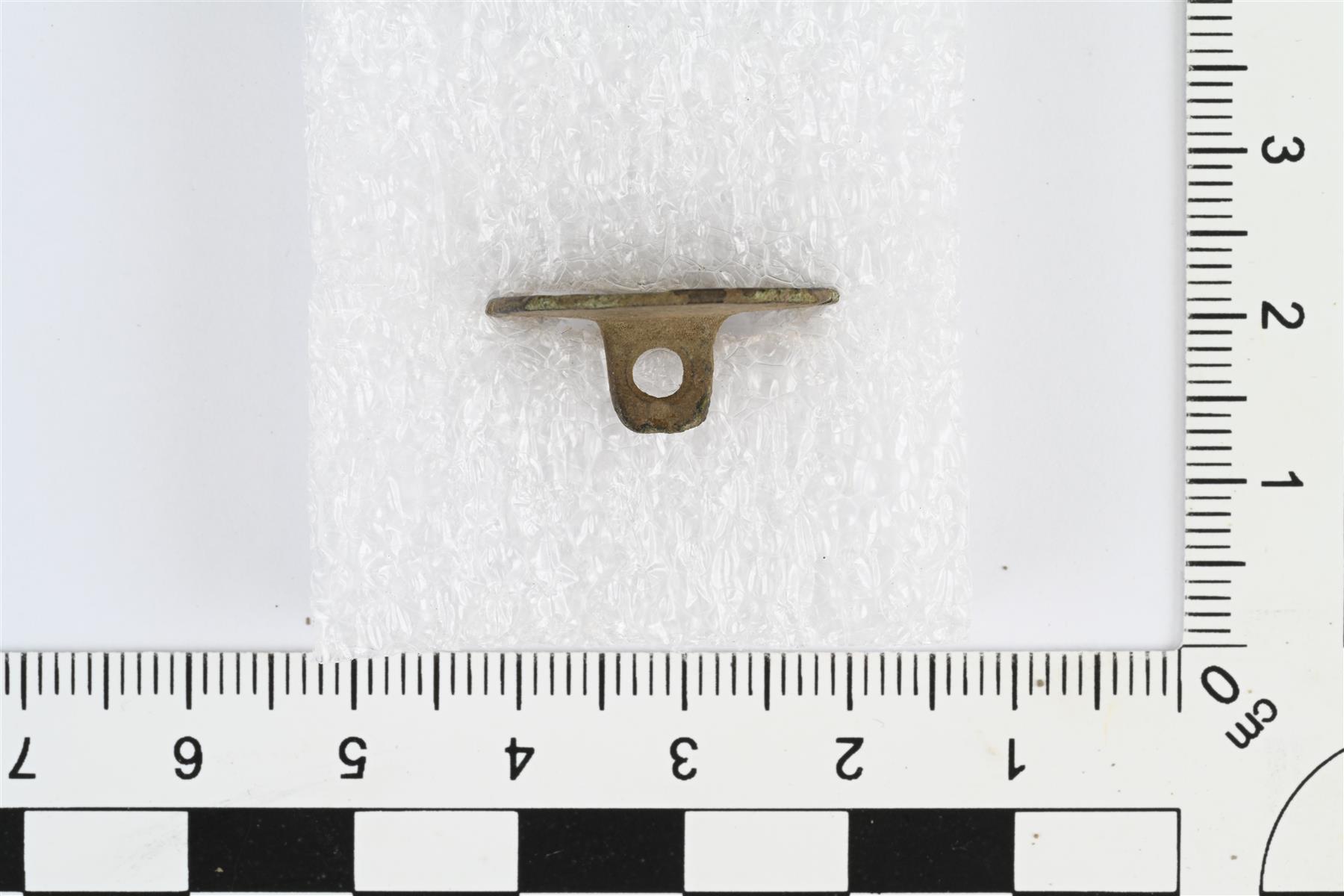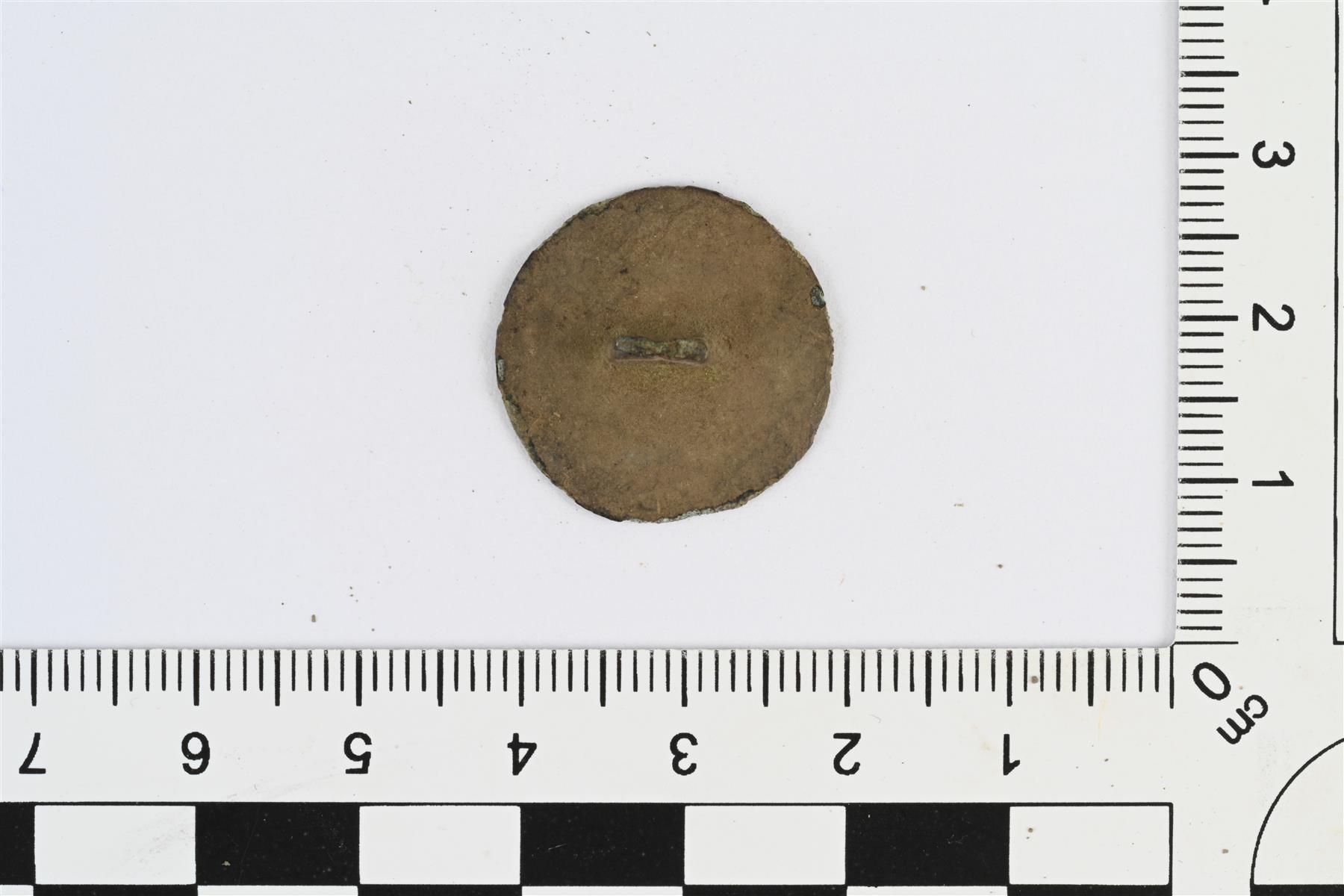| Litteä pyöreä nappi, jonka etupuoli hieman kovera. Taustapuolella kulmikas kanta. Etupuolella reunaa kiertävä nyörimäinen koristeraita ja keskellä pieni kohopiste. | |