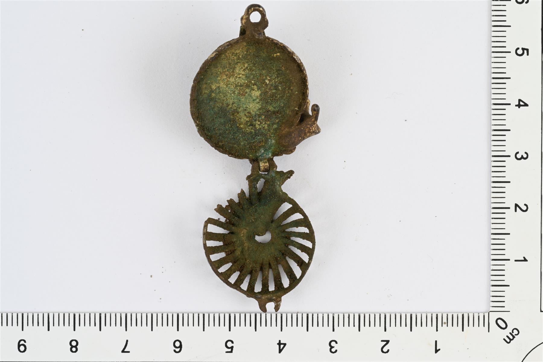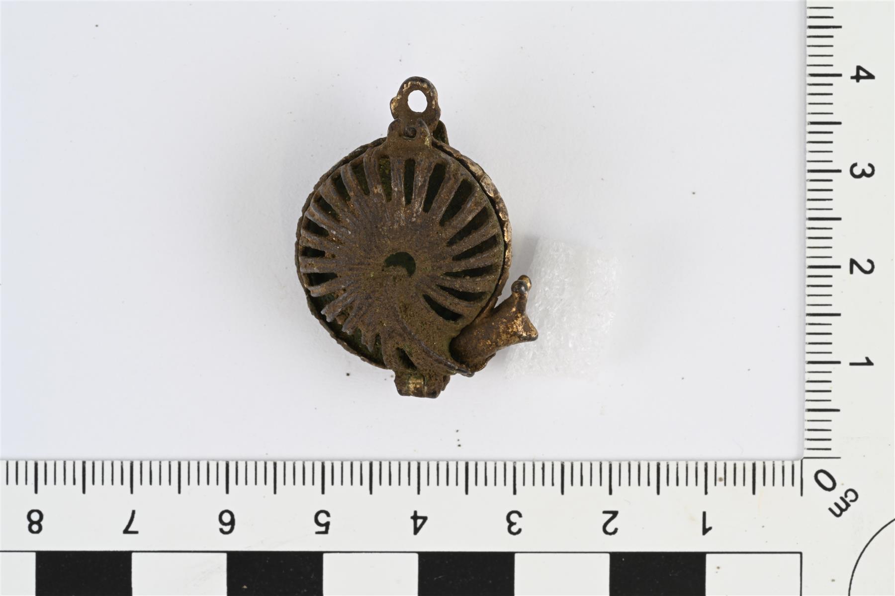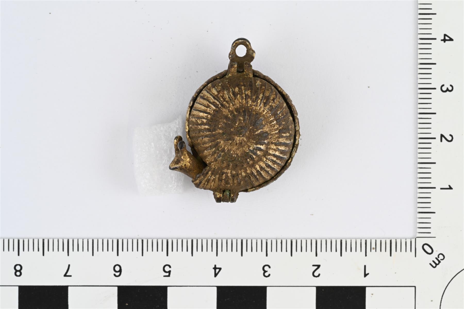 | Tuoksunappi. Kupariseosta, mahdollisesti kullattu. Kierteisen kotilon muotoinen, lähellä alareunaa kotilosta työntyy ulos etanan pää. Alareunassa sarana, jonka varassa nappi aukeaa kolmiosaiseksi: kahdeksi kuperaksi puoliskoksi ja niiden välissä olevaksi levyksi. Toiseen puoliskoon on etupuolelle kuvattu kotilon kierteet, jotka ovat poikkiviivaiset. Puoliskon kovera sisäpuoli on jaettu väliseinillä neljään osastoon, ja sitä vasten oleva välilevyn puoli on myös jaettu viivoilla neljään osaan. Jokaiseen osaan on kaiverrettu hajusteen nimi: S_üsk (Smüsk?), Cl_a__, Negl, P_s_. Toinen puolisko on puhkonainen, keskellä on pyöreä reikä ja sen ympärillä kapeita säteittäisiä reikiä. Tämän puoliskon sisäpuoli on yhtenäinen, ja sitä vasten oleva välilevyn puoli on koristelematon. Välilevyn reunassa molemmille pinnoille ulottuva piparkakkureunus. Levyn yläreunassa ripustuslenkki, ja sen molemmin puoli pienet tapit, joihin puoliskojen yläreunassa olevat väkäset kiinnittyvät. |