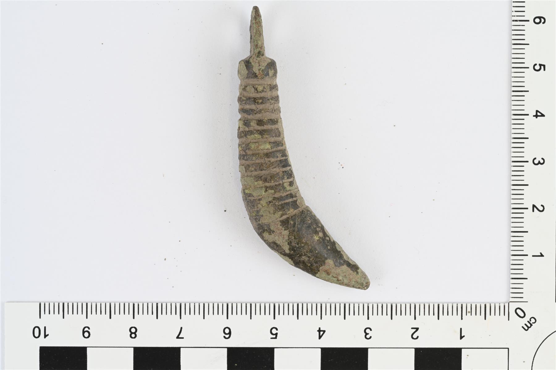 Ehjä karhunhammasriipus. Muodoltaan paksu ja loivasti kaartuva. Yläpäässä suuri ja tukeva ripustuslenkki. | |