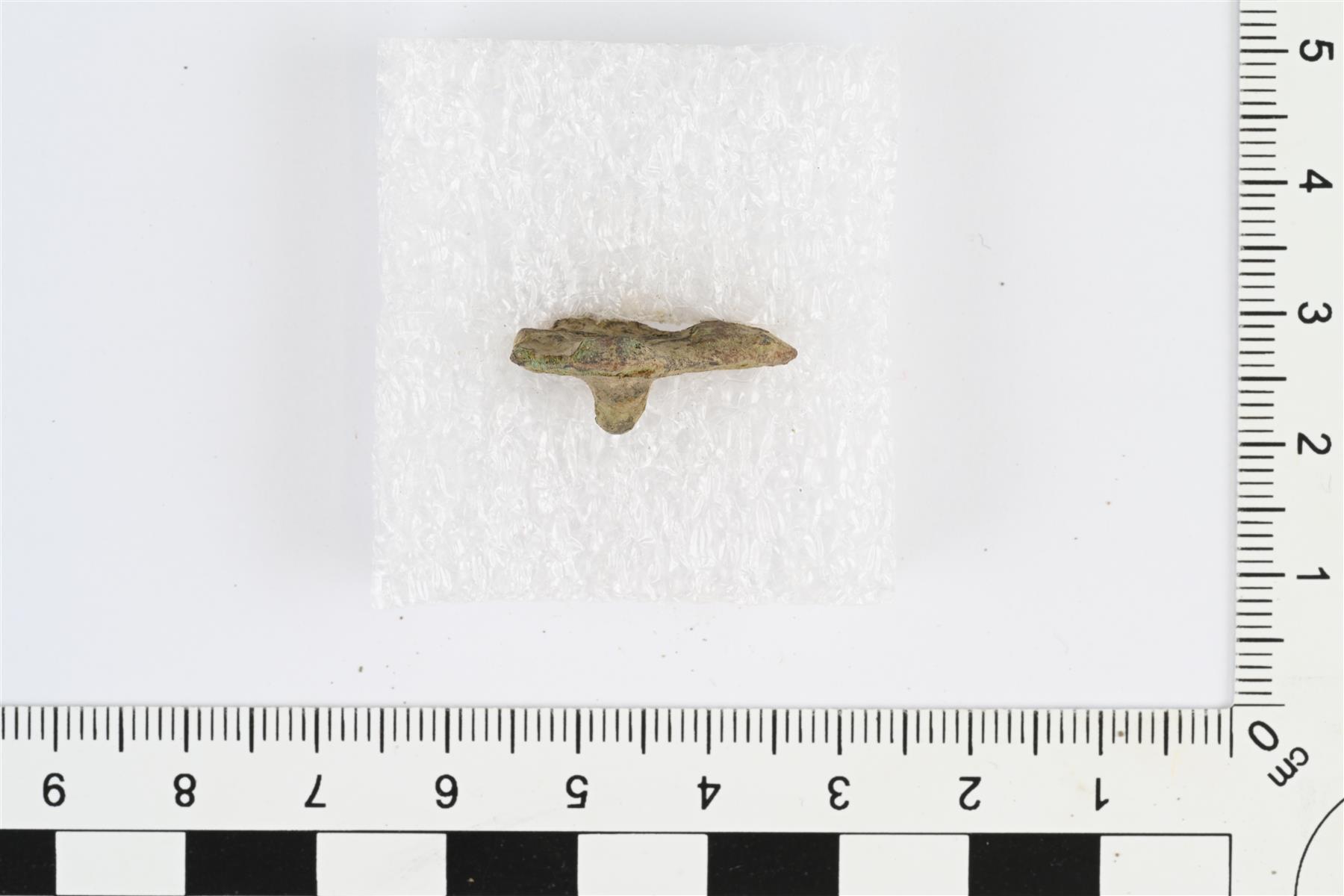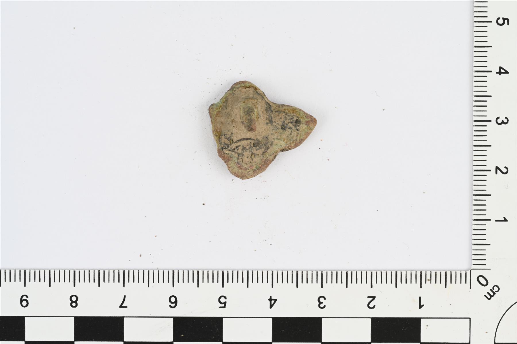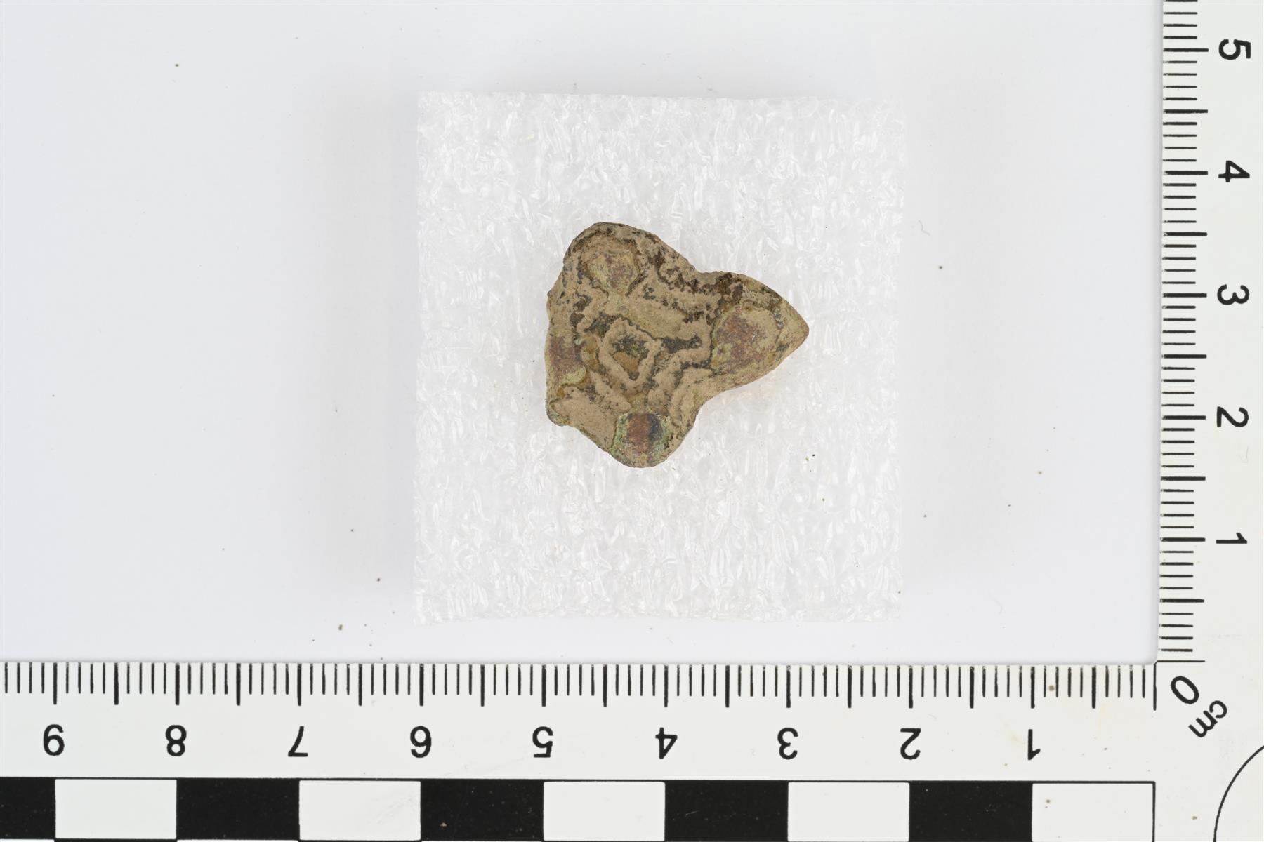 | Tasavartisen soljen katkelma. Katkelma on soljen päästä. Taustapuolella neulakota. Paksuus 8 mm mitattu neulakodan kohdalta, muun osan paksuus 3 mm. | |