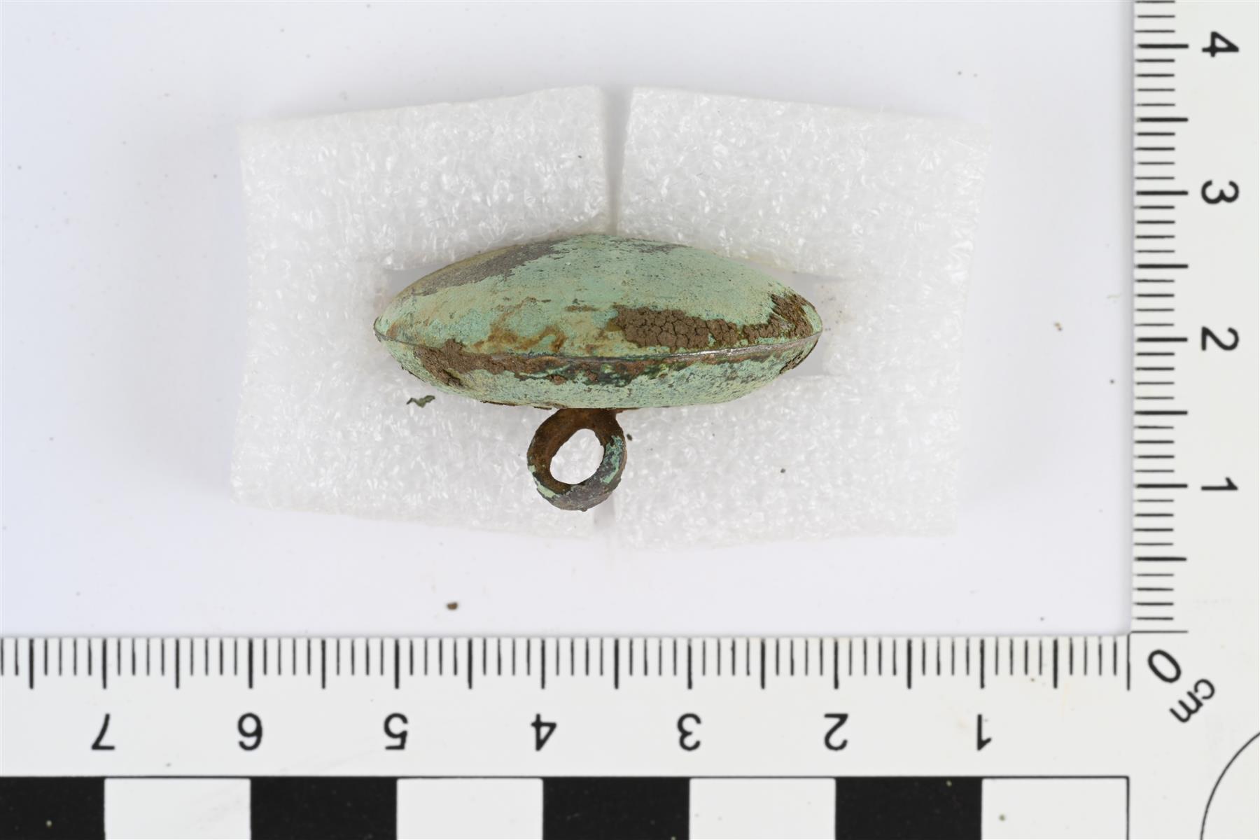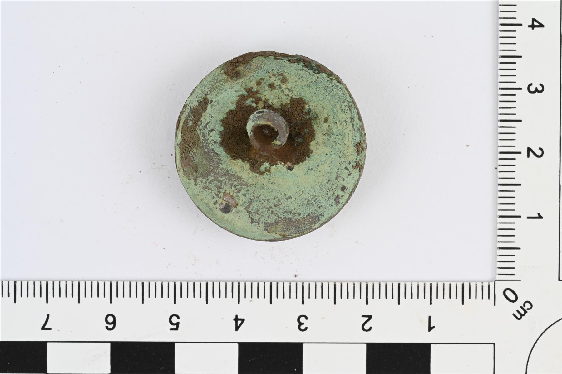 | Melko suuri nappi. Etu- ja taustapuoli molemmat kuperat, sisältä ontto. Taustapuolella lenkkimäinen kanta, joka taittunut sivuun ja nappi siltä kohtaa lytistynyt. Paksuus 18 mm mitattu kannan kohdalta, lytistymättömän osan paksuus 11 mm. | |