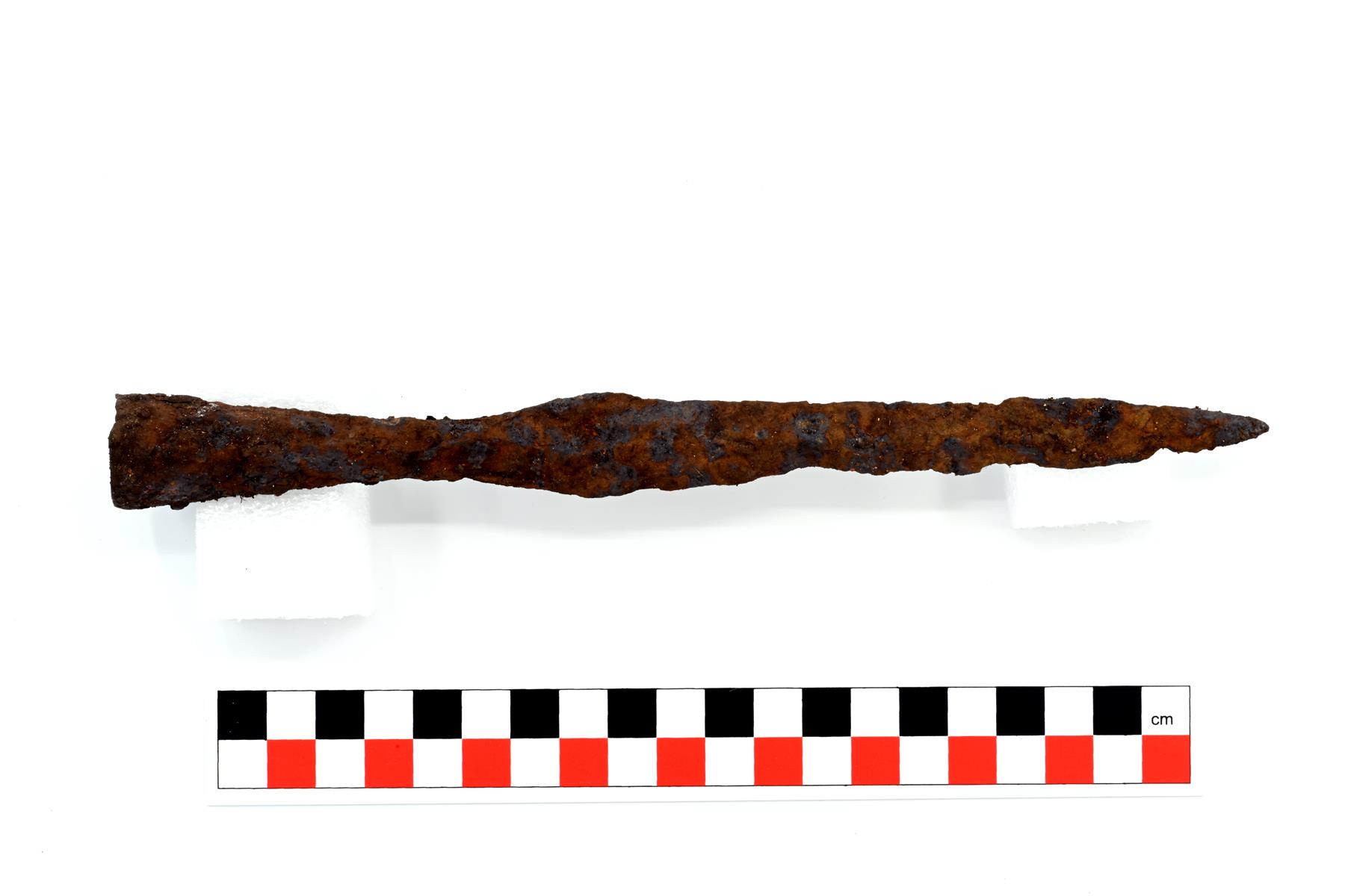 | Kokonaisena säilynyt putkikeihäänkärki. Lehti on kapea ja pistinmäinen. Lehden teränsuut ovat vaurioituneet. Putki on suhteellisen lyhyt ja poikkileikkaukseltaan pyöreä. Vastaa Yliskylän tyypin keihäänkärkiä. Vrt. Kivikoski Abb. 534. Ks. myös Salmo. Löytöön kuuluu myös maanäyte. | |