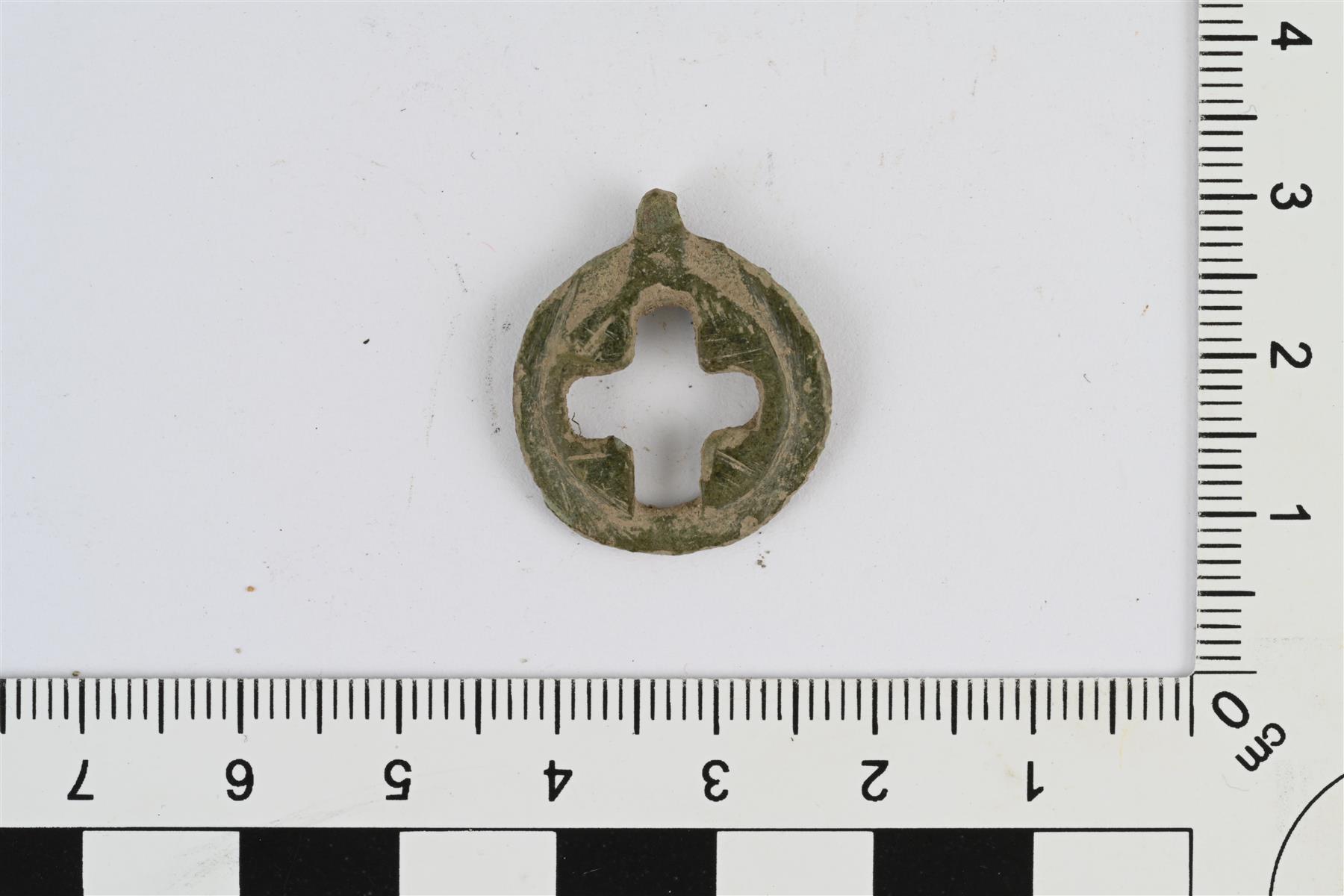 | Pyöreä riipus. Yläreunasta katkennut ripustuslenkki. Etupuolelta hieman kovera ja taustapuolelta kupera. Etupuolella koholla oleva reunus, jossa reliefikoristelua. Reunuksen keskellä olevassa syvennyksessä tasavartisen ristin muotoinen reikä. Paksuus 4 mm mitattu rikkonaisen ripustuslenkin kohdalta, riipusosan paksuus 3 mm. | |