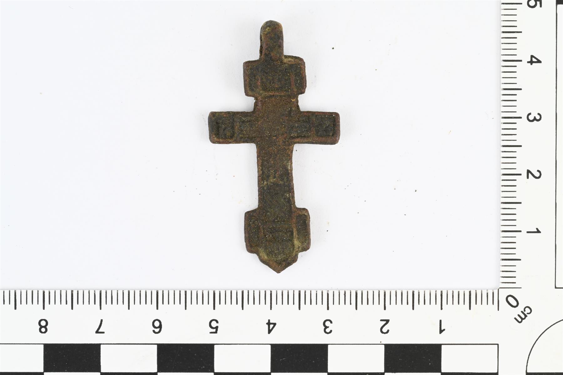 | Ristiriipus, ortodoksinen kasteristi. Yläpäässä ripustuslenkki. Etupuolella reliefikoristelua. Paksuus 6 mm mitattu ripustuslenkin kohdalta, ristin paksuus 1,5 mm. | |
