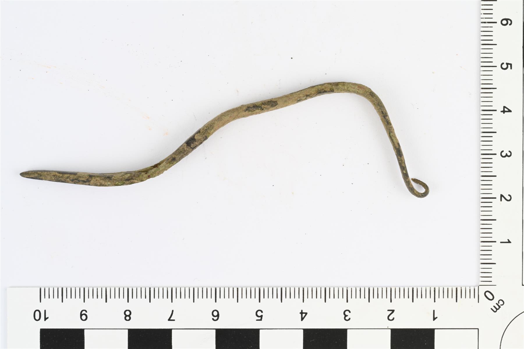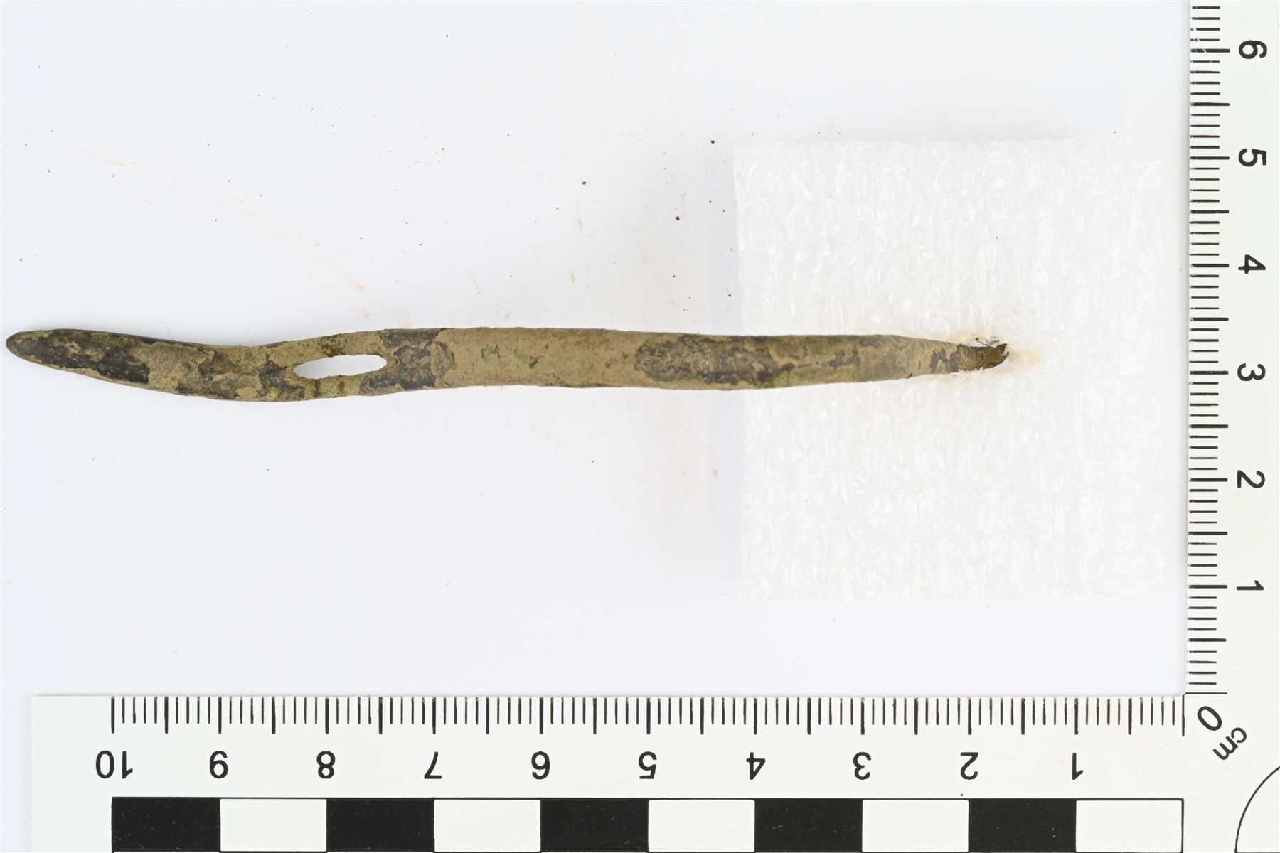 | Suuri silmäneula. Neulan pää suippo, ja soikea pitkänomainen silmä melko kaukana siitä. Vääntynyt, kärki taivutettu silmukaksi. Alkuperäinen pituus noin 115-120 mm. | |