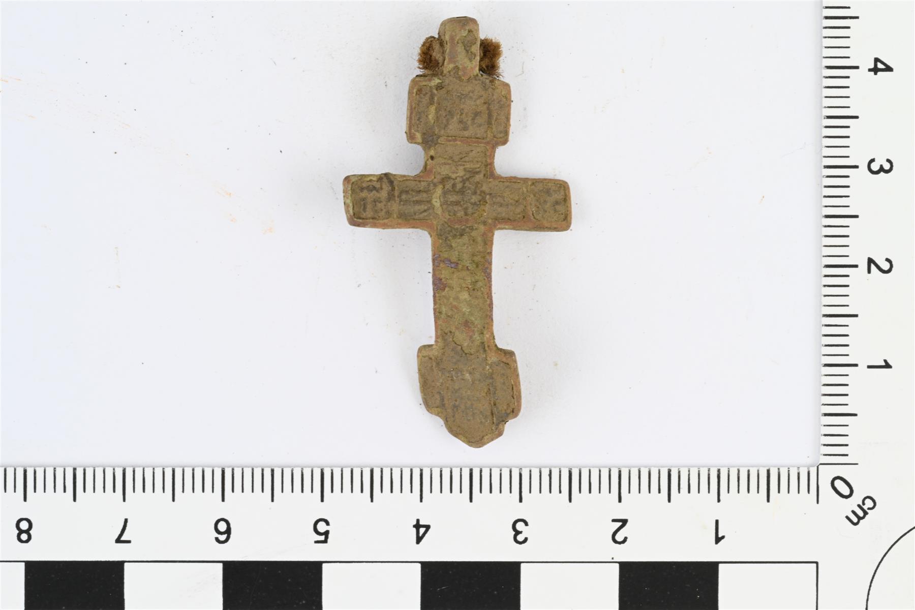 | Ristiriipus, ortodoksinen kasteristi. Yläpäässä ripustuslenkki, jossa jäljellä kuitua ripustusnauhasta. Pystysuuntaisten ristivarsien päissä levennykset. Etupuolella reliefikoristelua. Paksuus 6 mm mitattu ripustuslenkin kohdalta, ristin paksuus 1,5 mm. | |