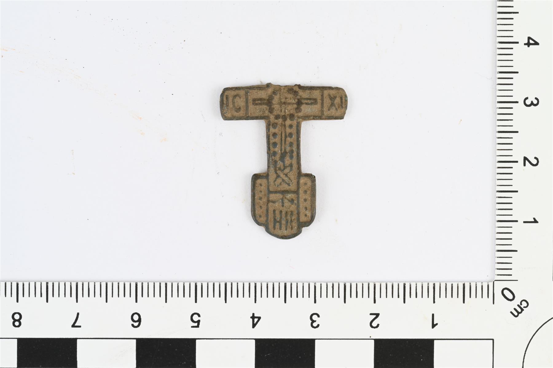 | Ristiriipus, ortodoksinen kasteristi. Ylin pystysuuntainen ristivarsi katkennut. Alimman pystysuuntaisen ristivarren päässä levennys. Etupuolella reliefikoristelua, jossa risti ja kyrillisiä kirjaimia. | |