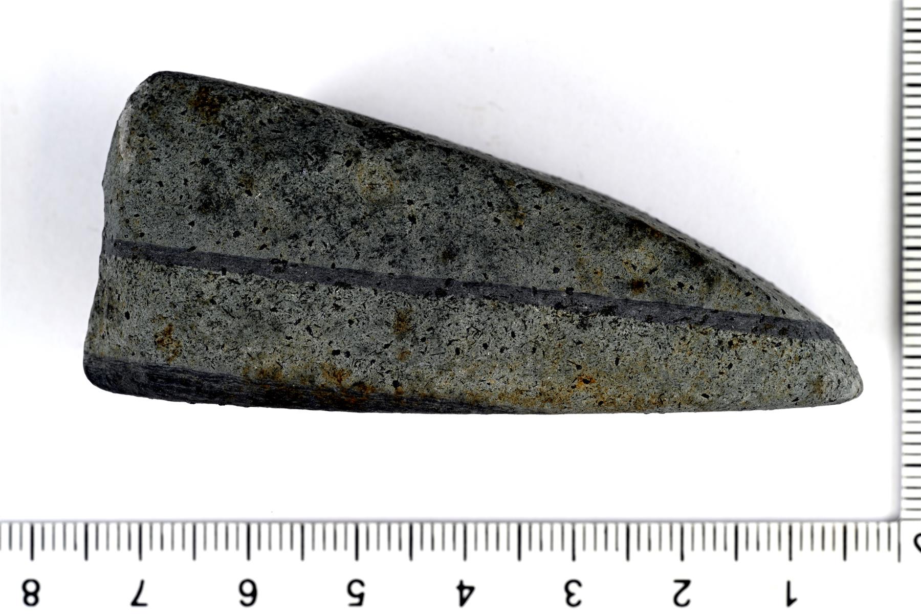 | Kivikirveen tai -taltan teräkatkelma. Jussi Moisio 29.8.2023 KM45346:1_1_kivikirves |