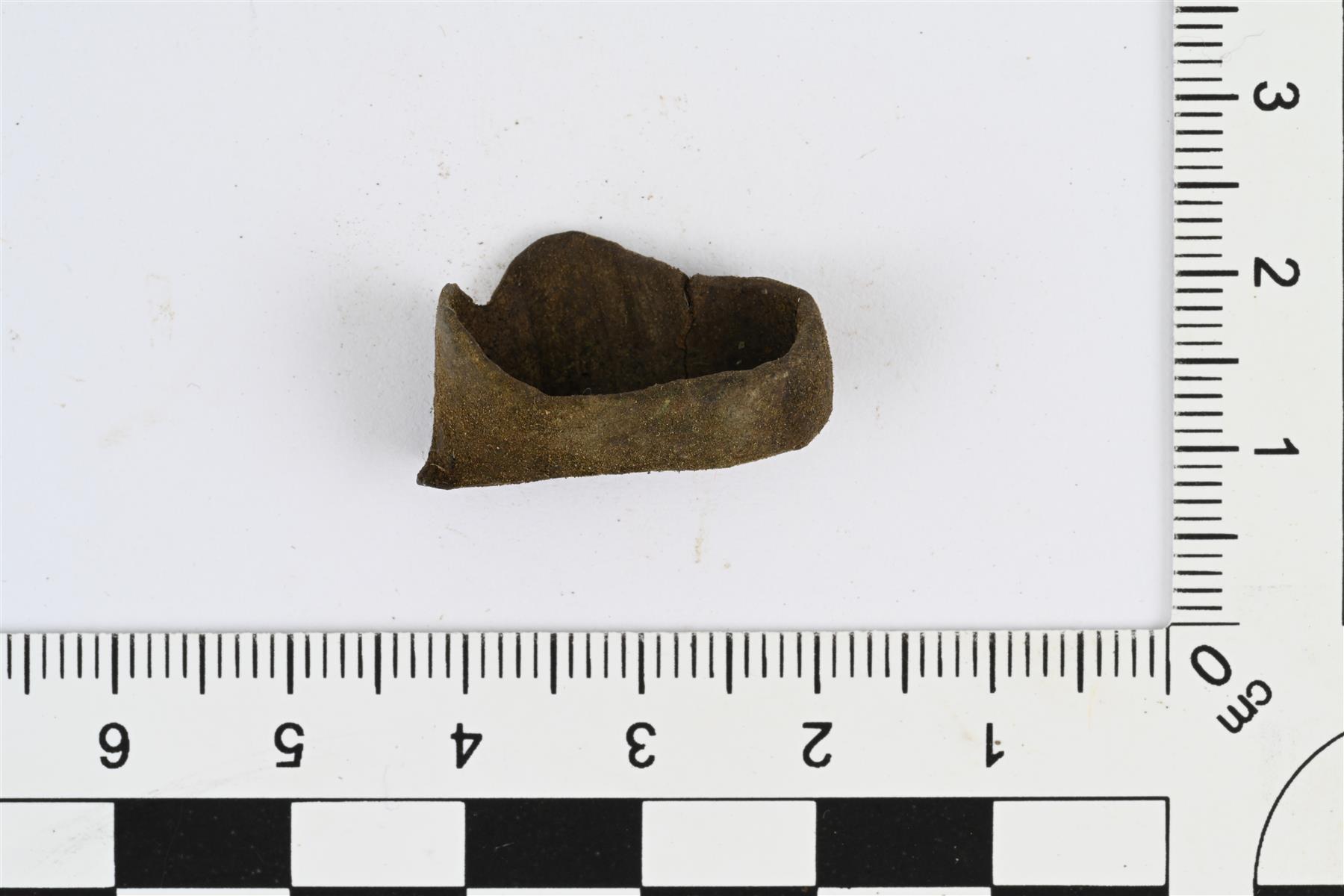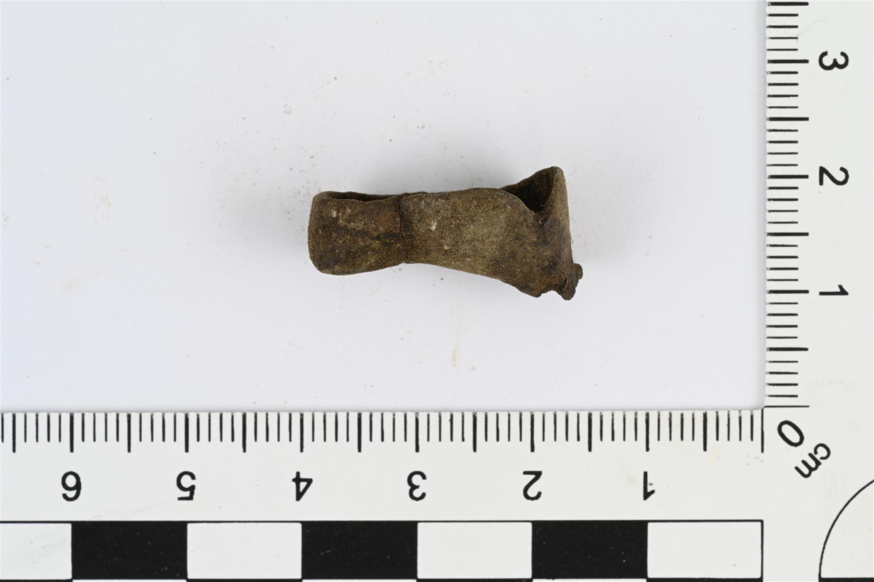 | Litistynyt ja lyttyyn painunut sormus. Kehä on edestä muotoiltu kahdeksi pyöreäksi levennykseksi, jotka vääntyneet. Kehän paksuus 1,5 mm ja takaosan ehjä leveys 6 mm. | |