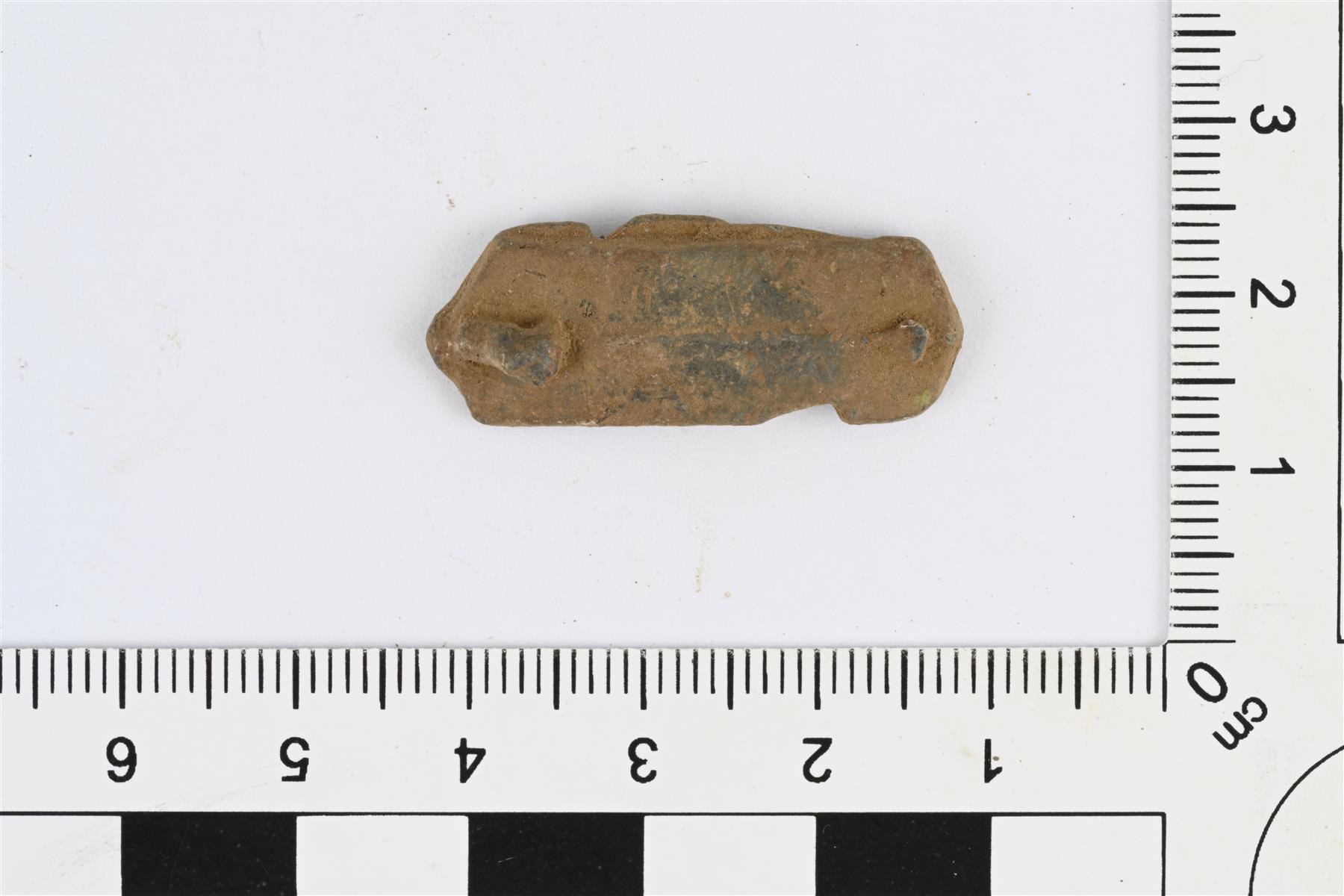 | Kupariseosesine tai katkelma. Pitkänomainen litteä esine, kaarevaksi taivutettu. Muodoltaan suorakulmio, jonka lyhyet sivut kolmiomaiset. Ulkokaaren puolella pinnalla pitkittäinen valusauma ja mahdollisesti lyttyyn mennyt lenkki, toisessa päässä pieni katkennut tappi. | |