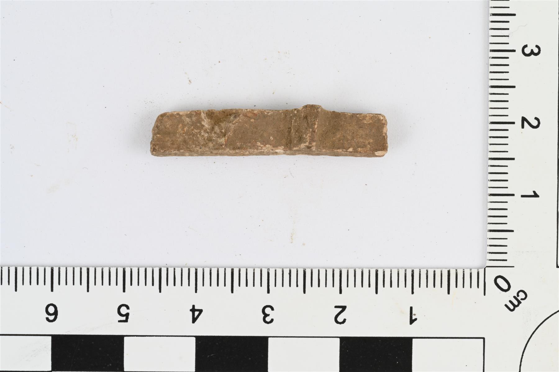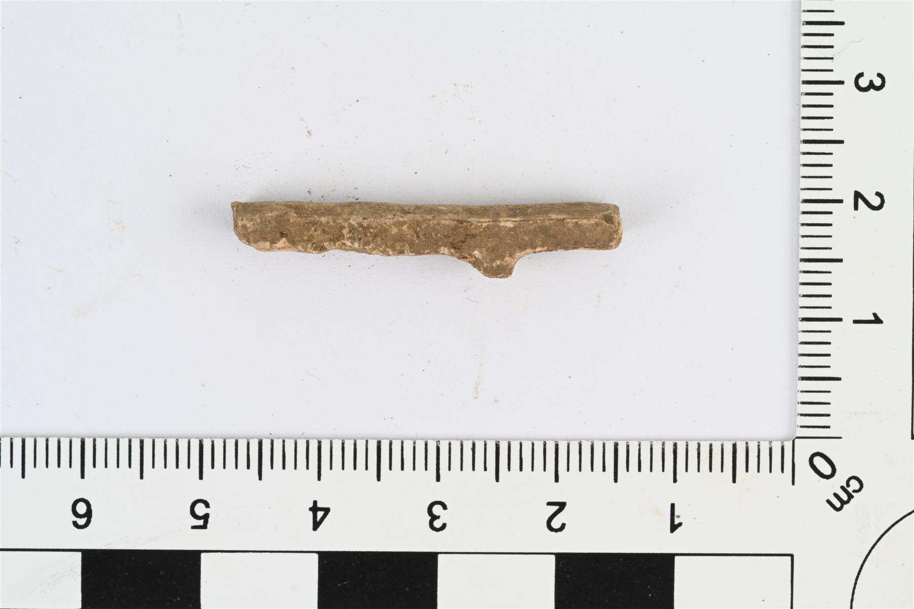 | Lyijyesineen katkelma. Pitkänomainen tasalevyinen katkelma, poikkileikkauksessa etupuoli kupera ja taustapuoli tasainen. Taustapuolella poikittainen kohouma ja mahdollisesti toisen samanlaisen kohouman murtumakohta. | |