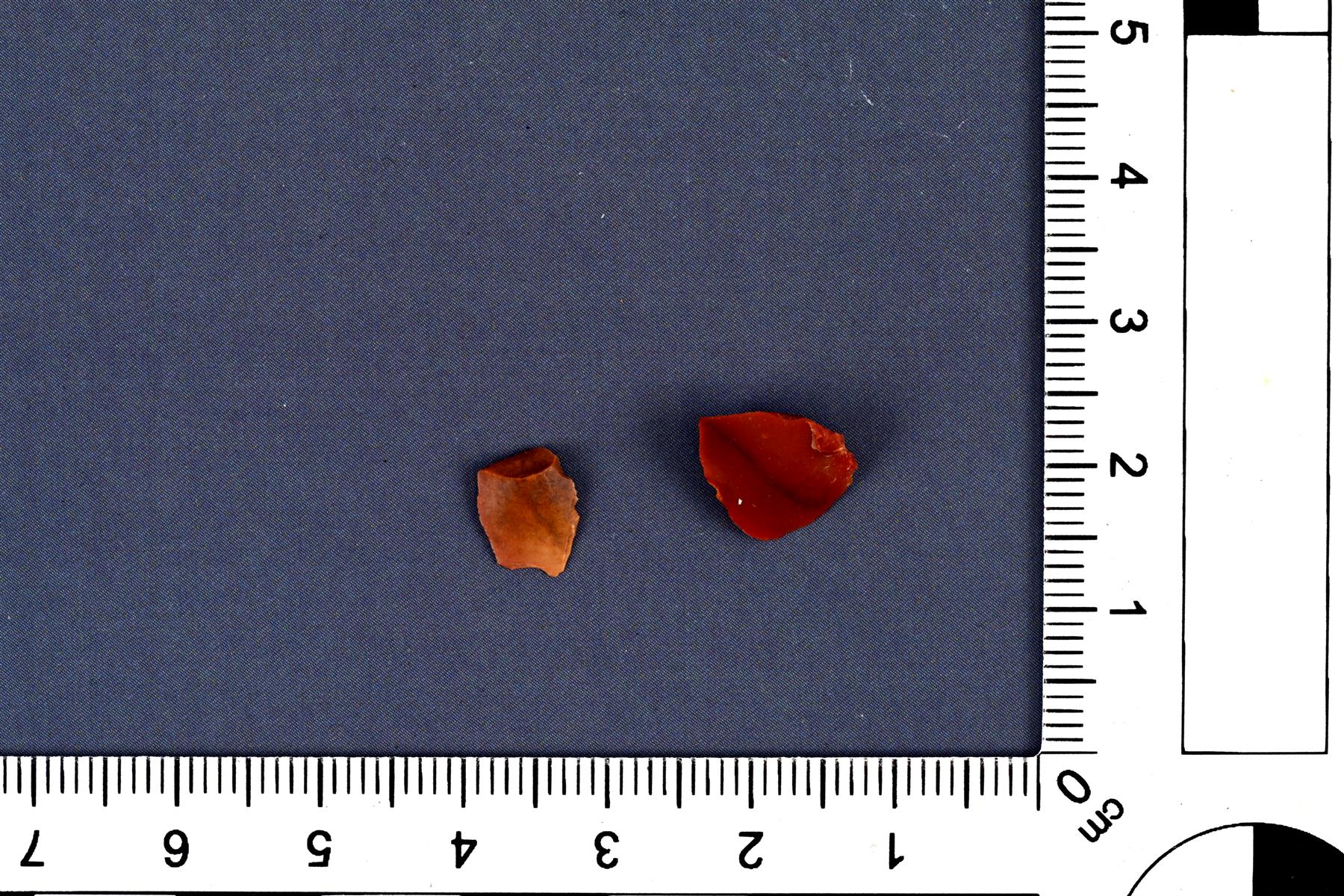 | Kaksi pientä pii-iskosta. Yksi on punertava ja toinen on ruskea. | |