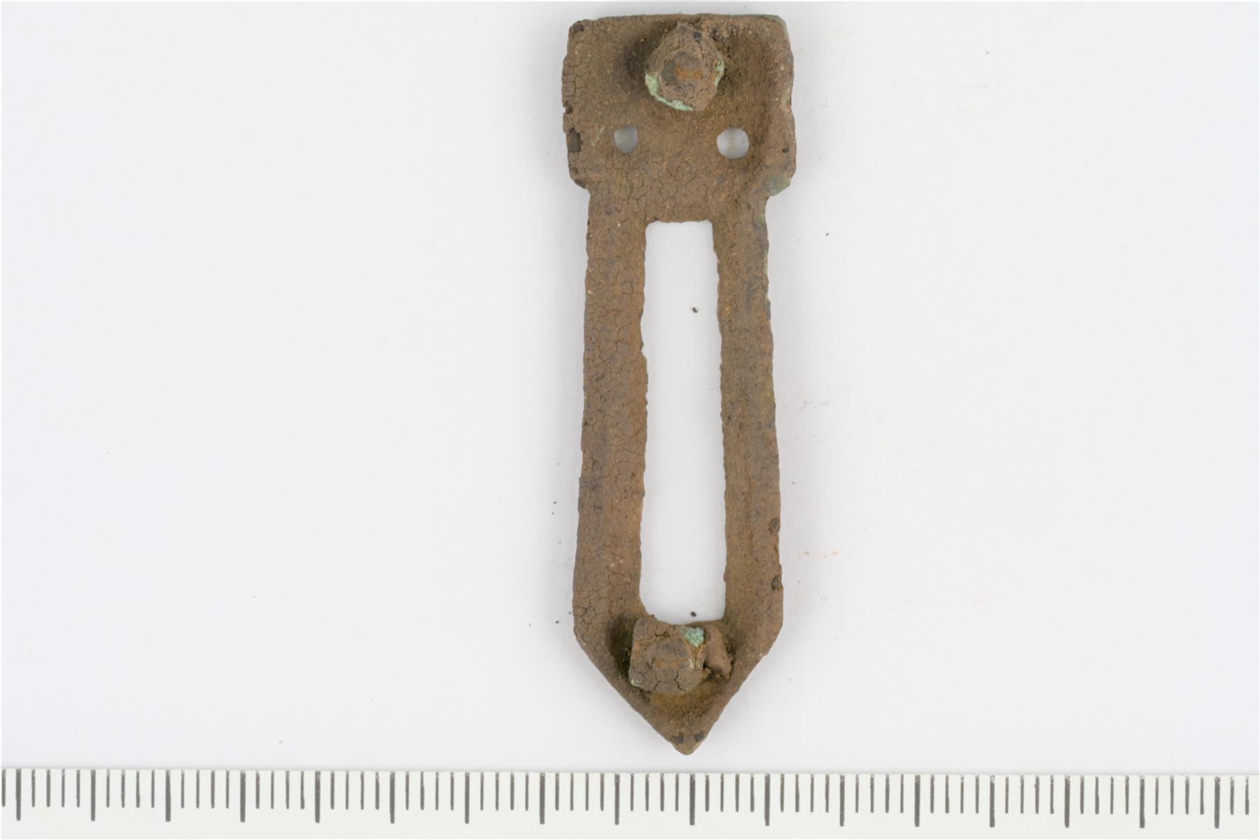 Esineen kääntöpuolella nelikulmaisessa kantalevyssä ja kolmiomaisessa varren päässä kiinnitystapit, joiden päissä on leveähköt kupariseoksiset niitinkannat paikoillaan. |
