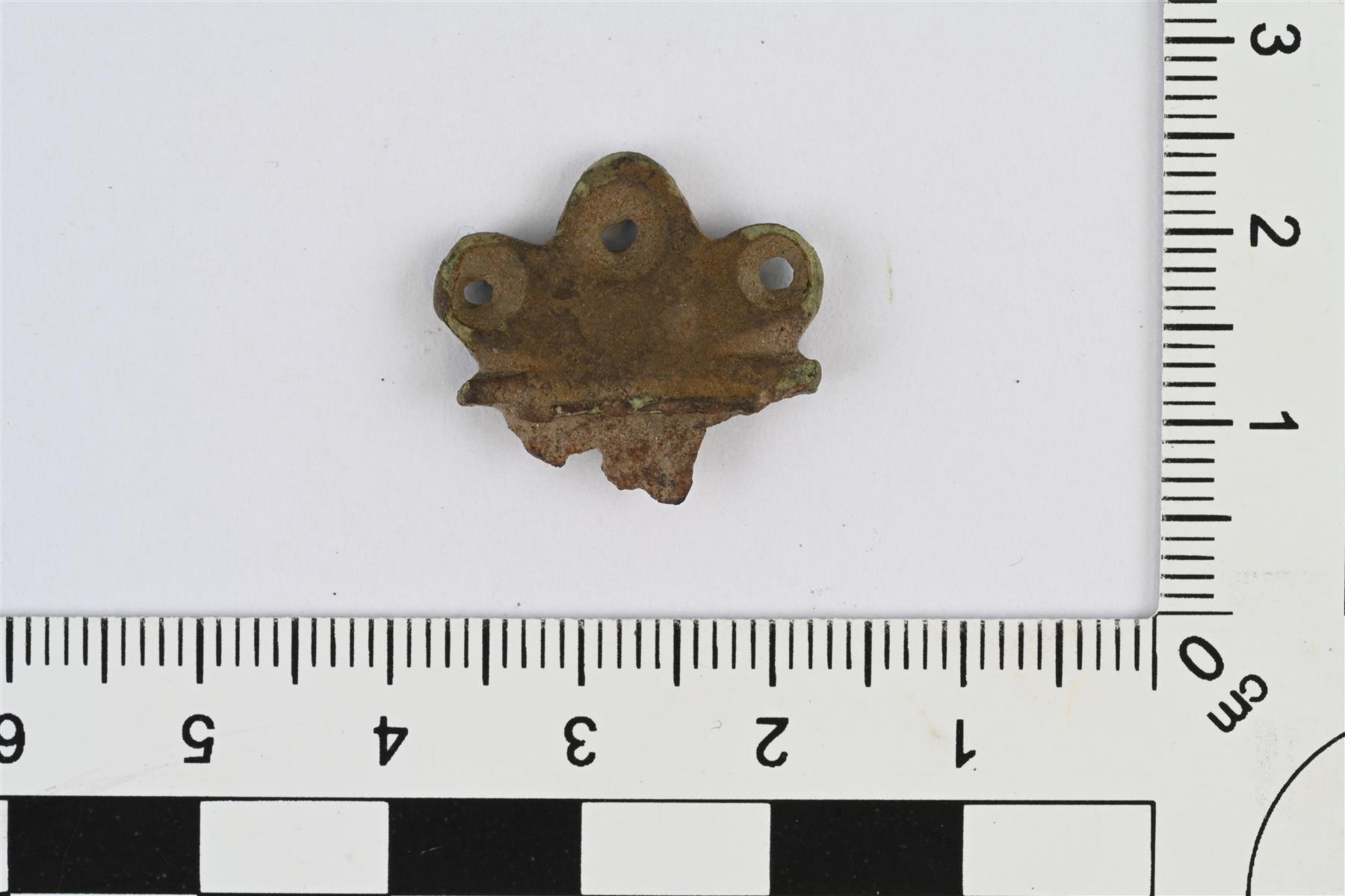 Pöytäveitsen kahvan ylähela. Poikkileikkaukseltaan litteän soikea, litistyy yläreunaa kohti. Yläreunassa kolme pyöristyvää sakaraa, joissa pyöreät reiät. Alareunassa jäljellä hieman veitsen litteää ruotoa. | |