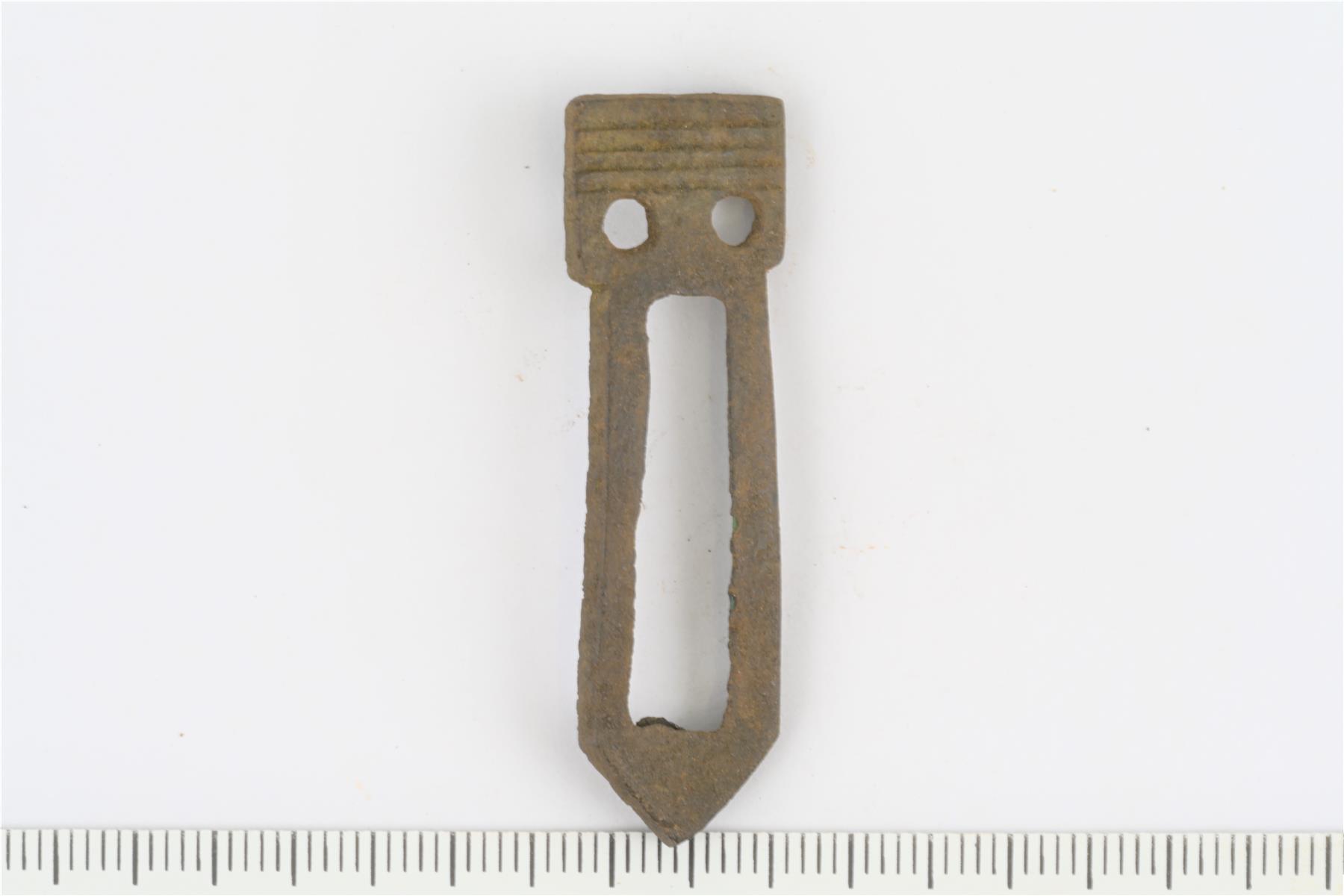| Permiläinen vyönhela. Kannassa nelikulmainen levy, jossa neljä poikkiuurretta ja niiden alla kaksi reikää. Kannasta lähtee suorasivuinen varsi, jonka pää on kolmiomainen. Varren sisällä on tyhjä suorakaiteenmuotoinen tila.