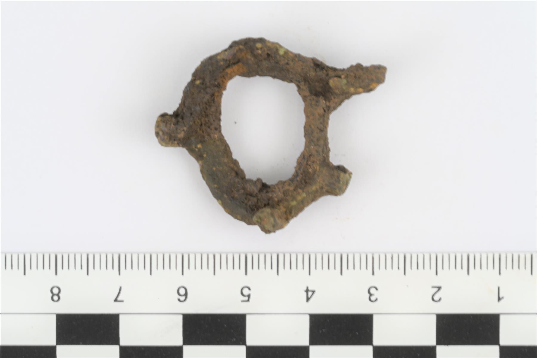 Neulankärjen kohdalla on ulkoneva nipukka. Suulenkin kehikon ulkolape on poikkileikkaukseltaan viisto (paksunee ulkoreunasta sisäreiän reunaan). Lenkin yläpäässä outo kääntöpuolen suuntaan työntyvä tappi (valukanavan jätös tai sulamisen aiheuttama deformaatio?). |