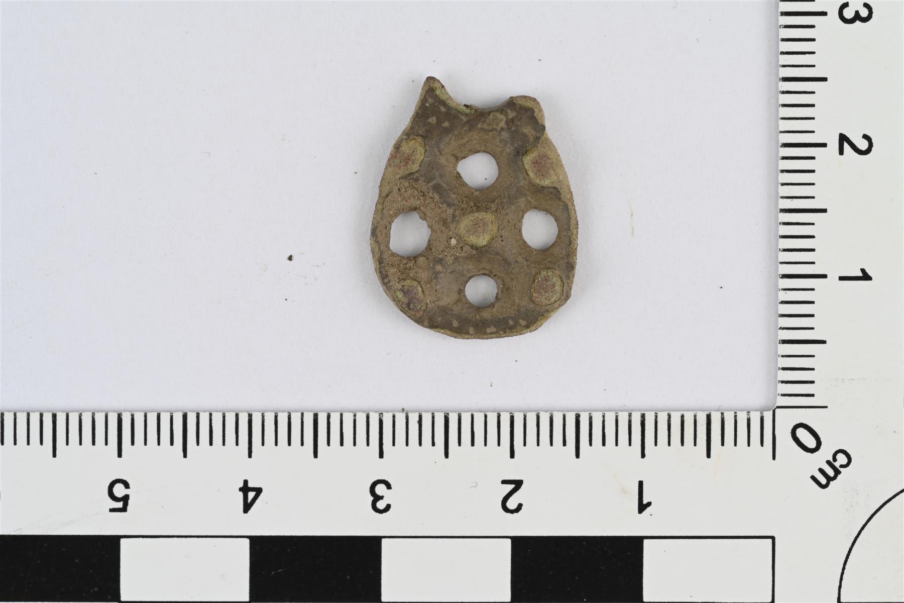 | Riipuksen katkelma. Pyöreähkö, pisaranmuotoiseksi venyvä litteä esine. Kapeasta päästä katkennut lenkki. Leveässä pyöreähkössä päässä neljä pyöreää reikää vinoneliön muodossa. Etupuolella lisäksi viisi tappia, joista yksi reikien keskellä ja neljä muuta neliön muodossa reikien välien kohdalla hieman reikien ulkopuolella. Muistuttaa riipusta kuvassa Kivikoski 1973, Abb. 809. | |