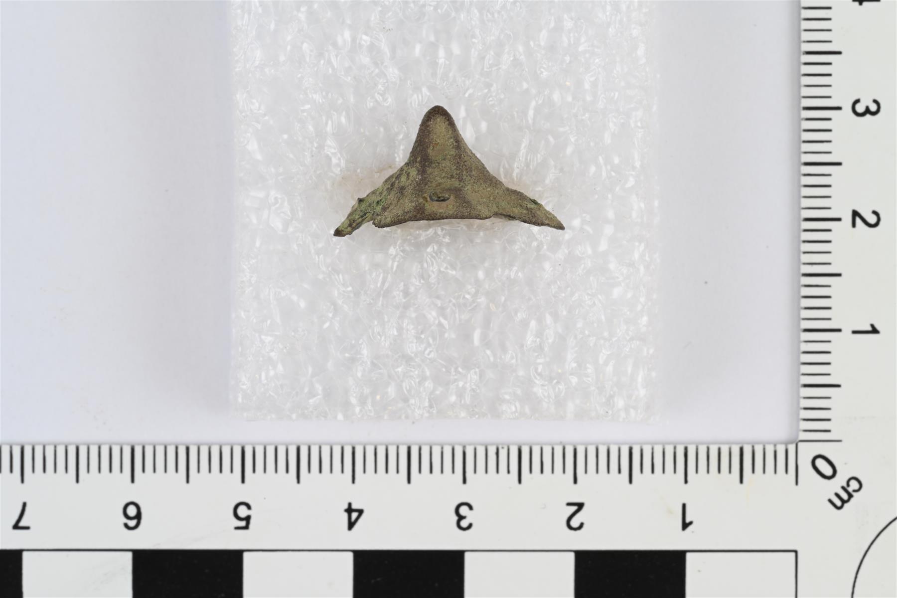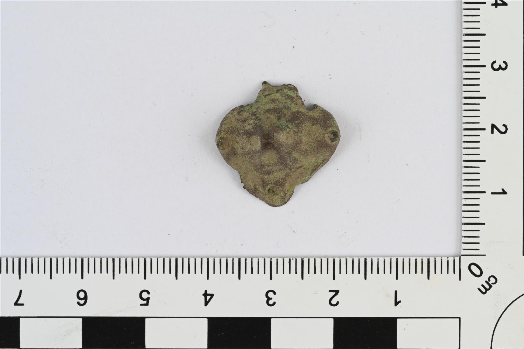| Hela tms. Ohutta levyä, levyn paksuus 0,5 mm. Kulmista pyöristetyn vinoneliön tai tyylitellyn nelilehtisen kasvin muotoinen. Etupuoli kupera ja keskeltä voimakkaasti suippeneva, taustapuoli kovera. Kulmissa pienet niitit. | |