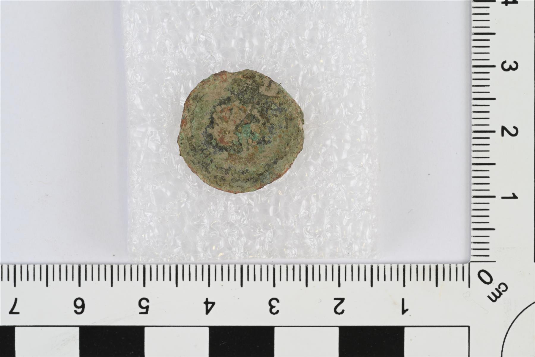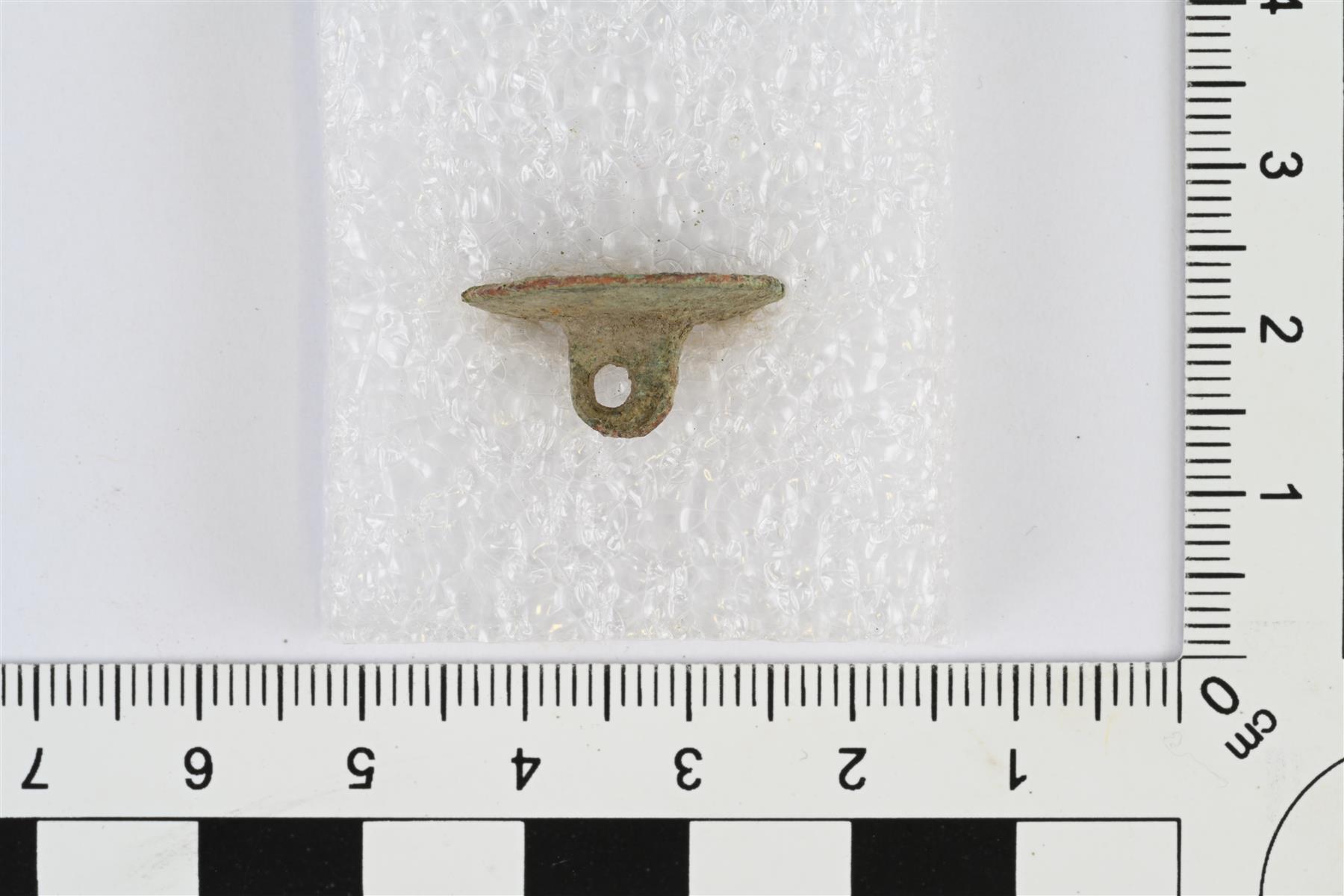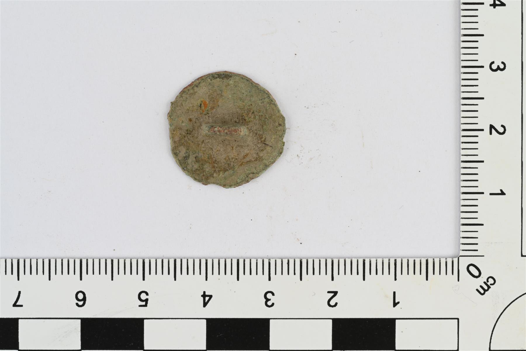| Nappi. Pyöreä ja litteä, etupuoli hieman kovera ja taustapuoli kupera. Taustapuolella lenkkimäinen kanta. Etupuolella koristeluna keskellä kukka. | |