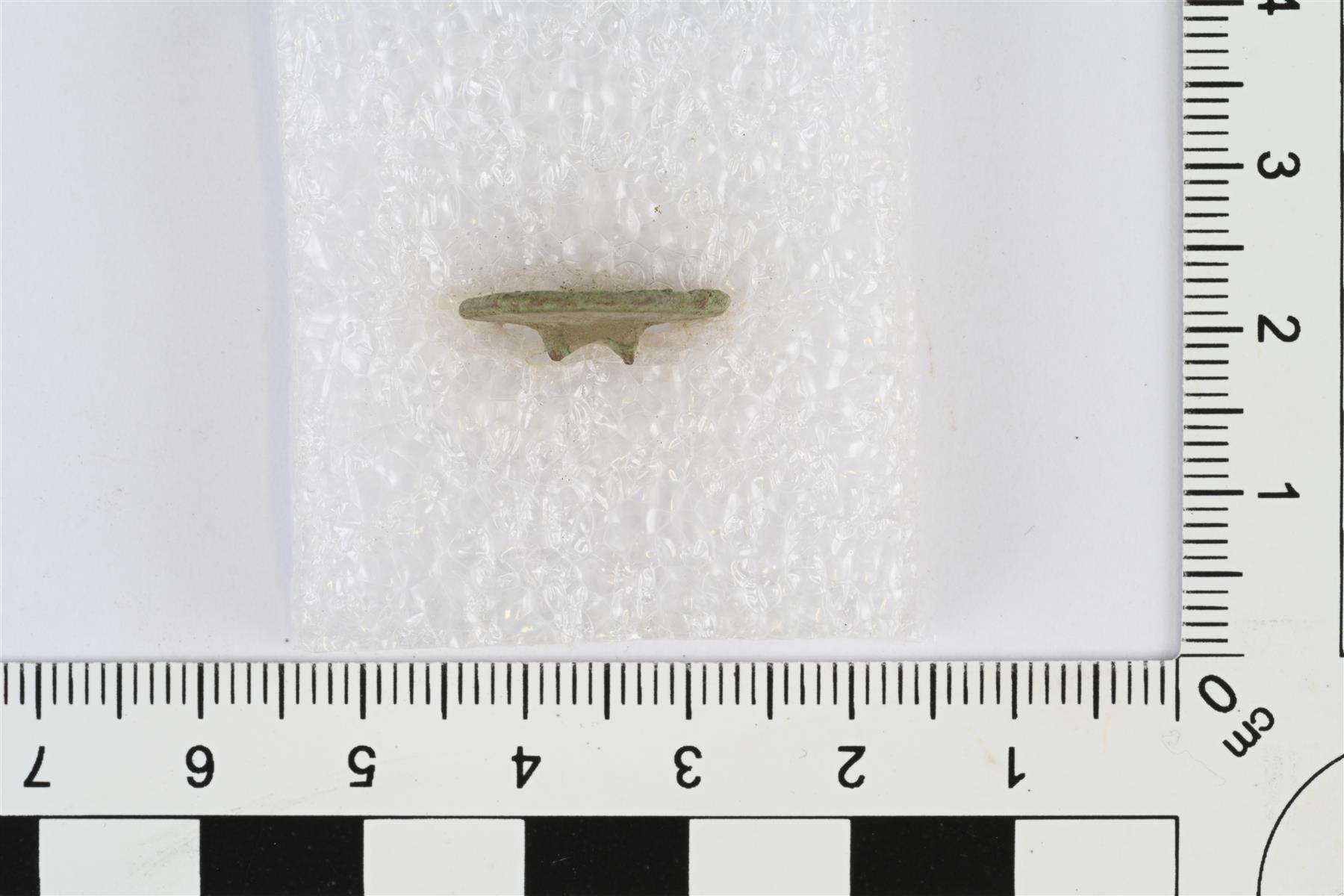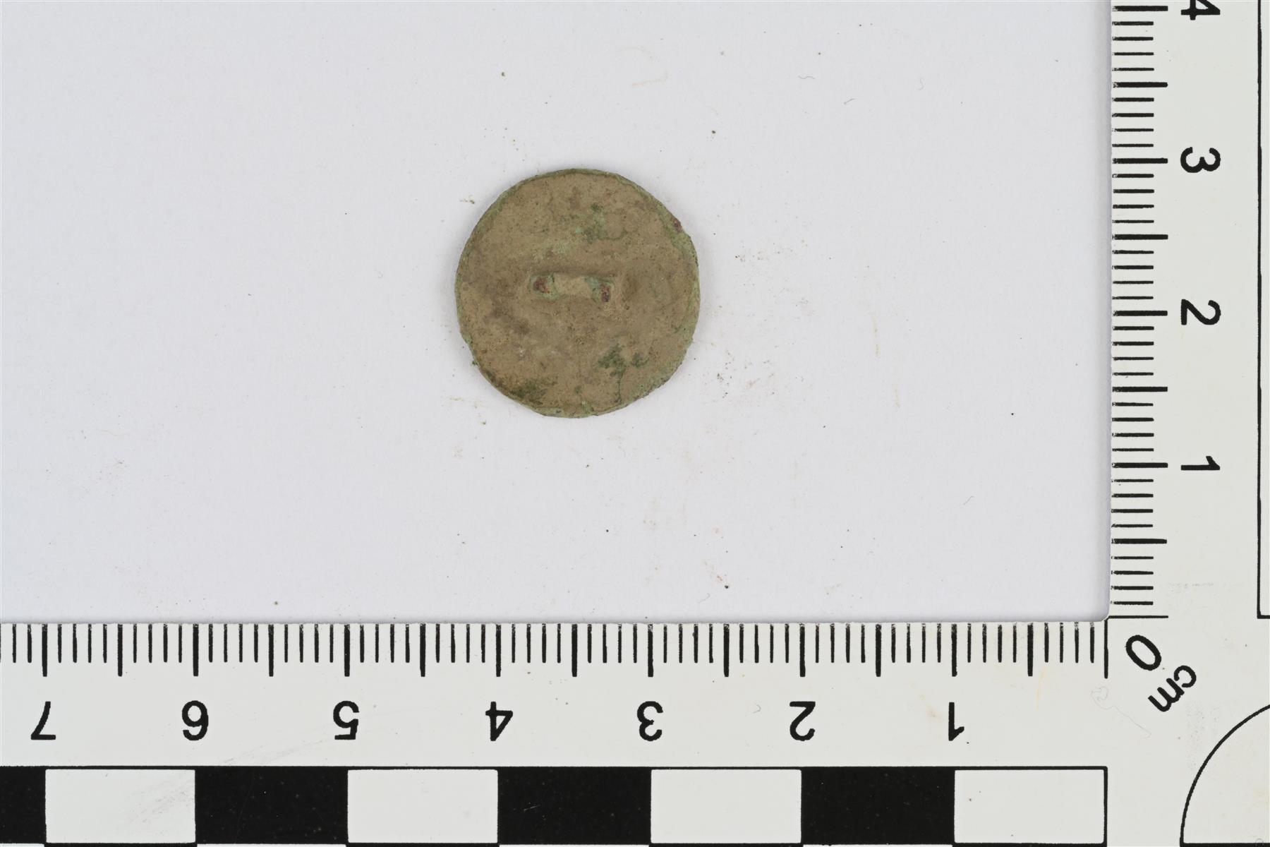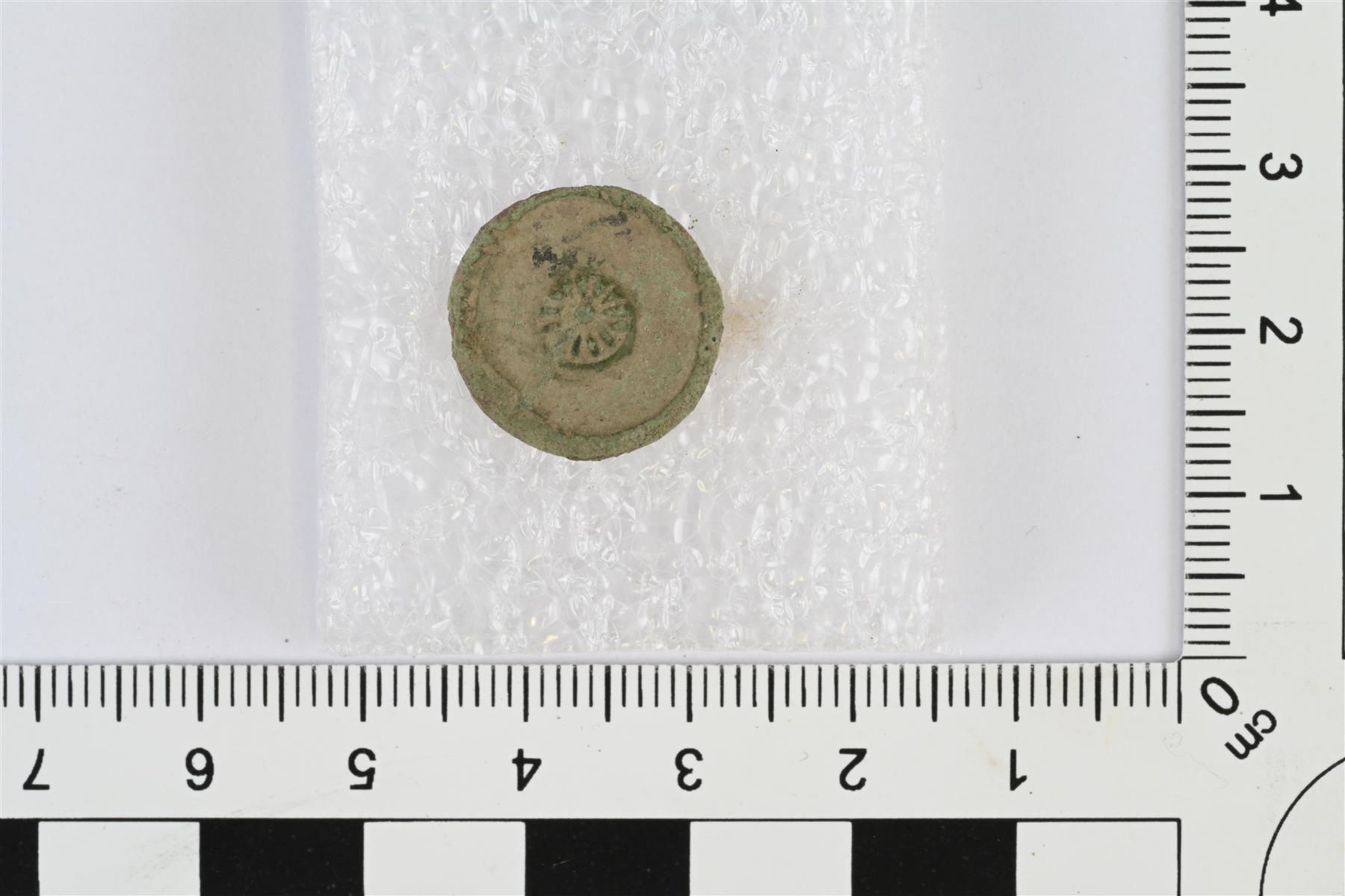 | Nappi. Pyöreä ja litteä, etupuoli hieman kovera ja taustapuoli kupera. Taustapuolelta katkennut kanta. Etupuolella reliefikoristeluna reunaa kiertävä pisteviiva ja keskellä kukka. | |